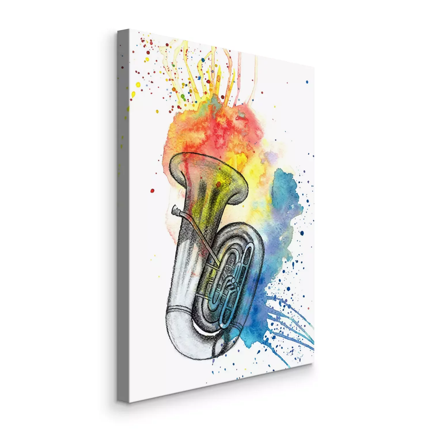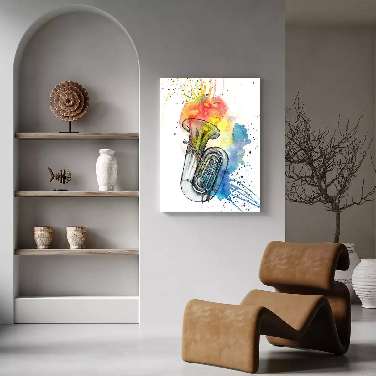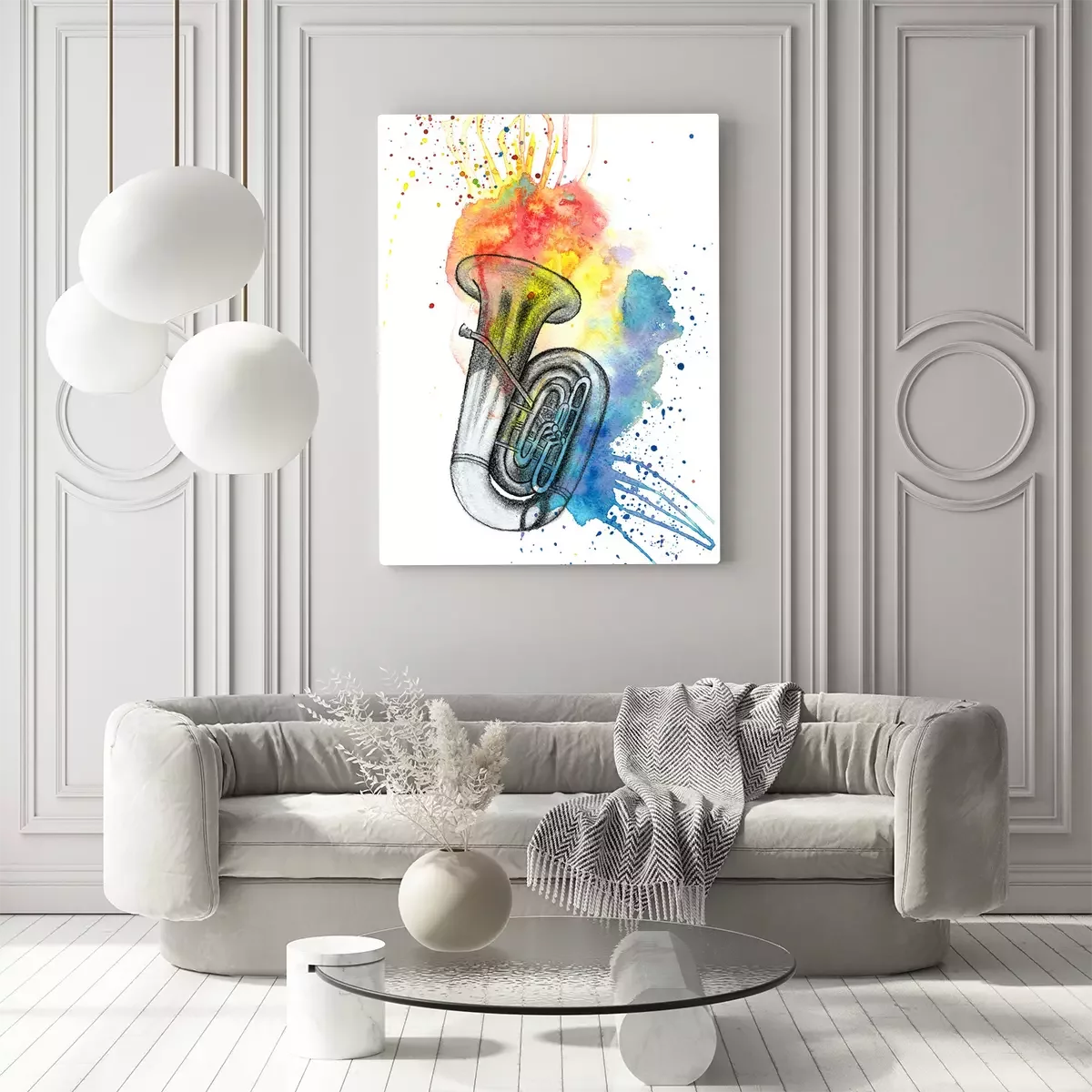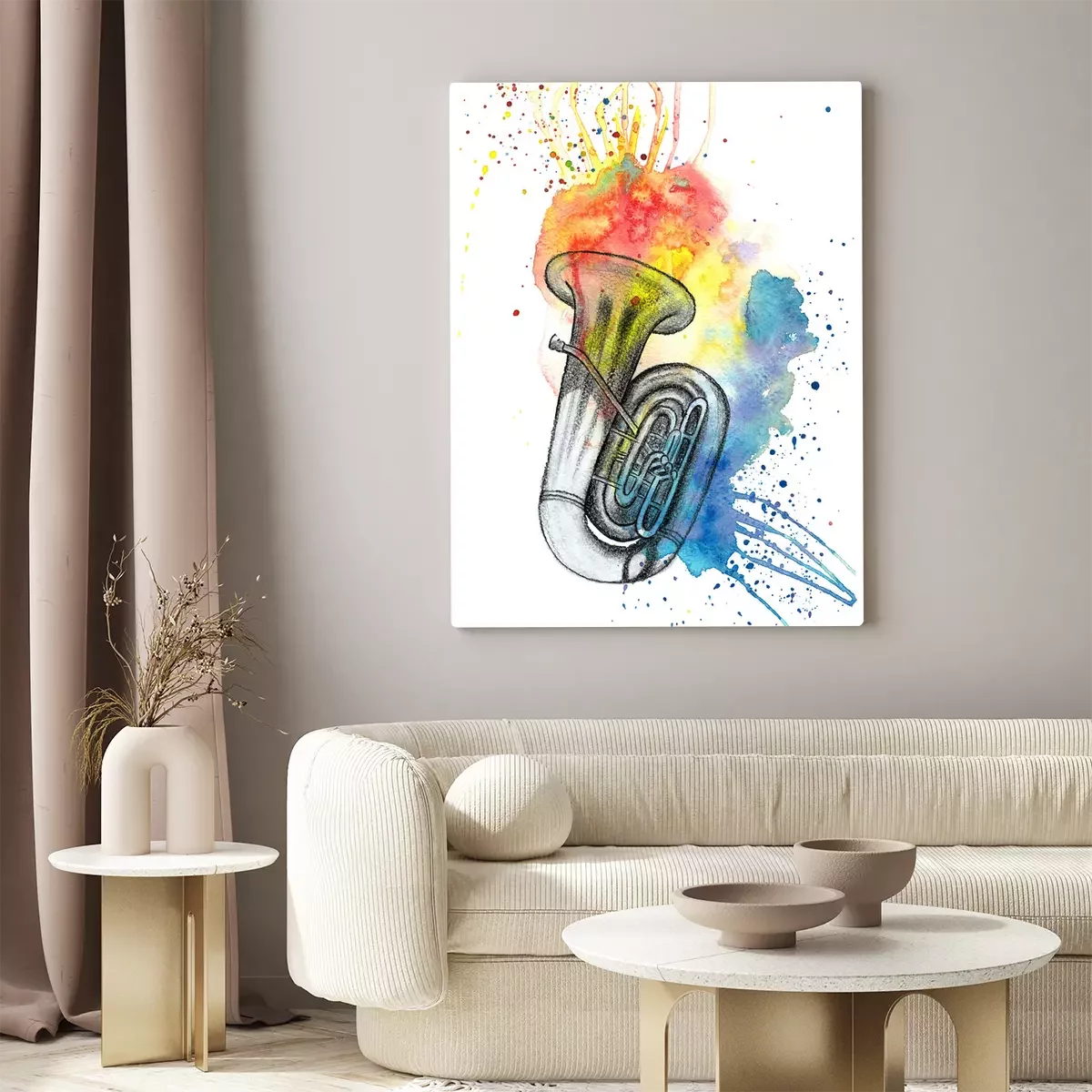 Canvas Waterverf multicolored spatten vlekken met een potloodschets van een muziekinstrument tuba, jazz muziek