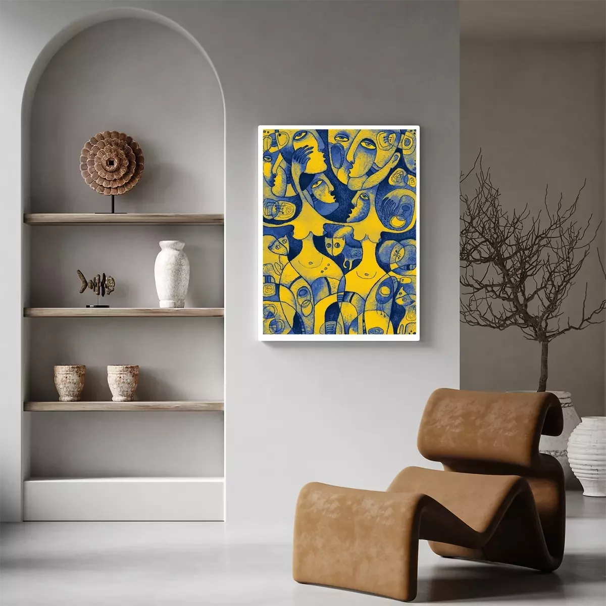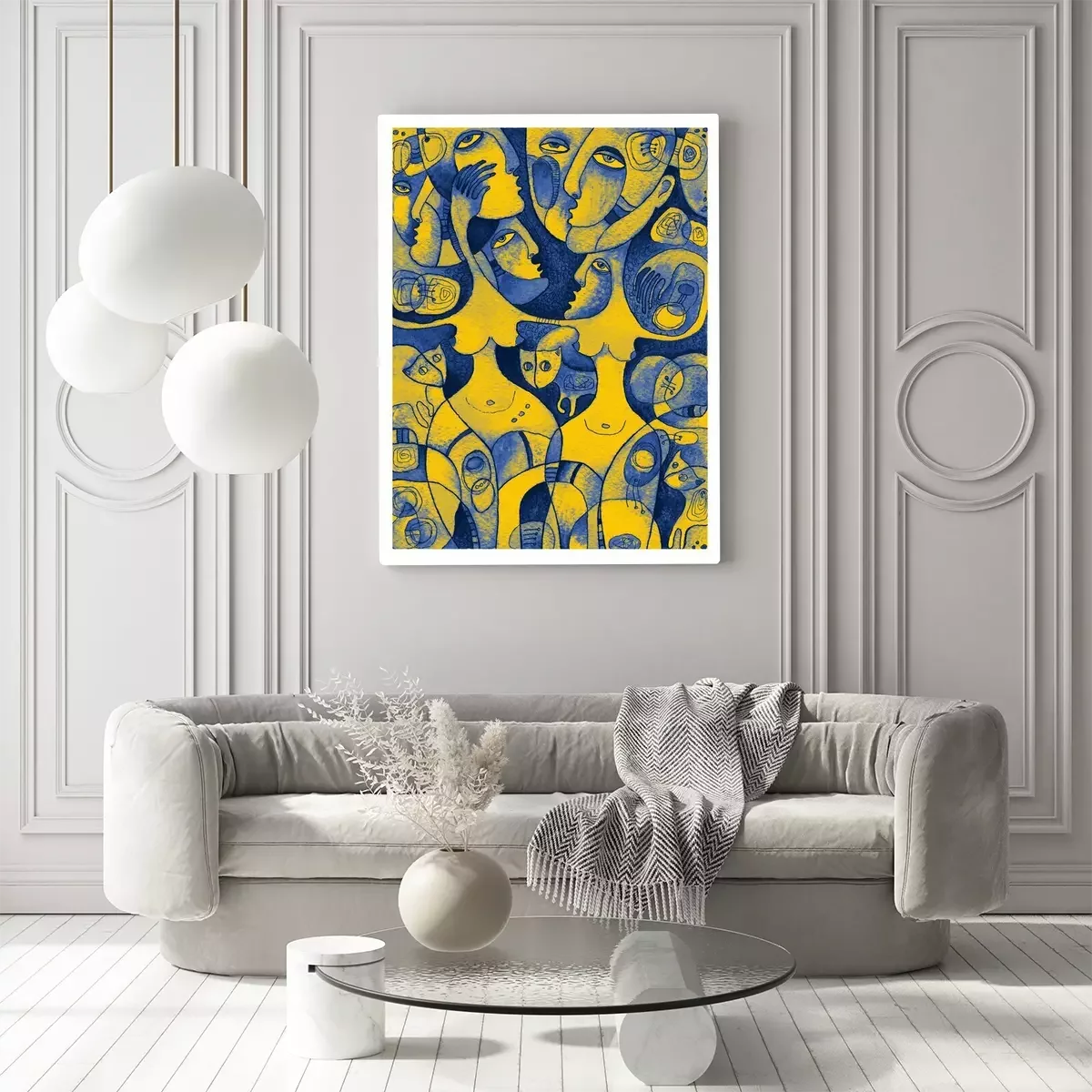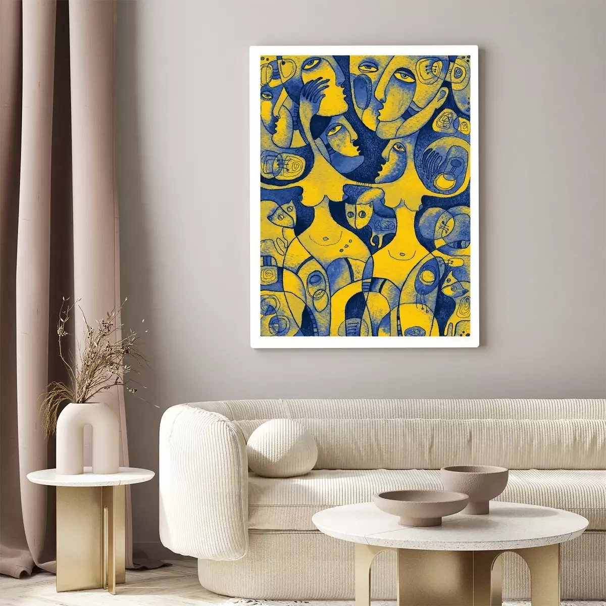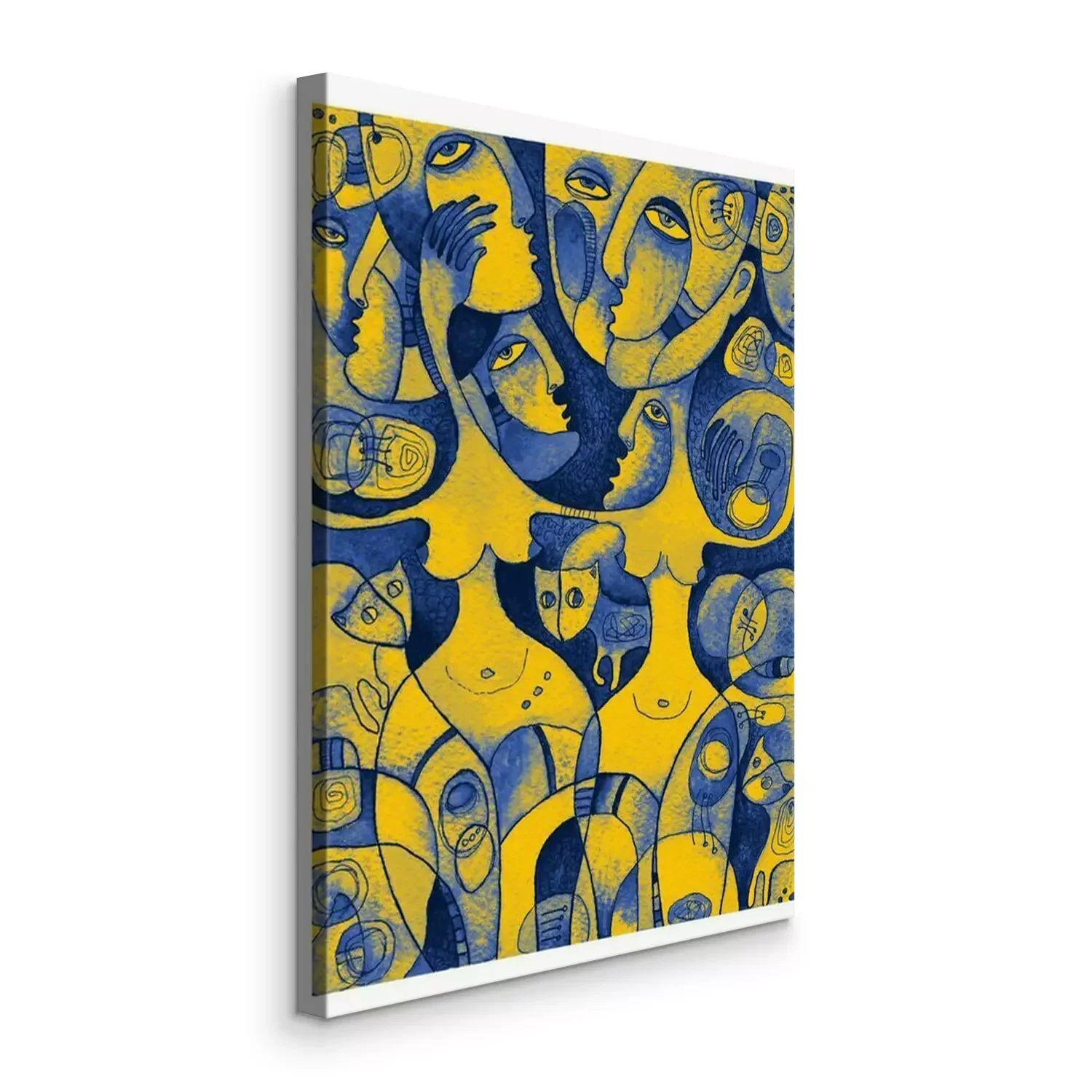 Canvas Waterverfkunstwerk met dansende vrouwen in heldere blauwe en gele kleuren