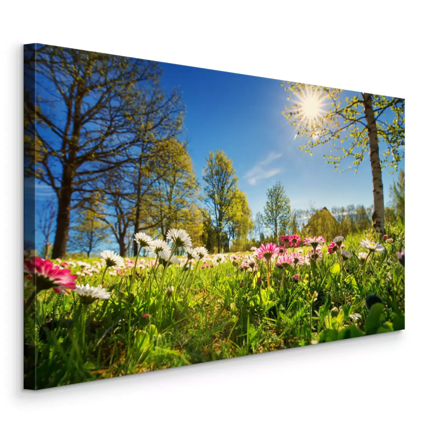 Canvas: Weide met veel witte en roze lente madeliefjebloemen in zonnige dag