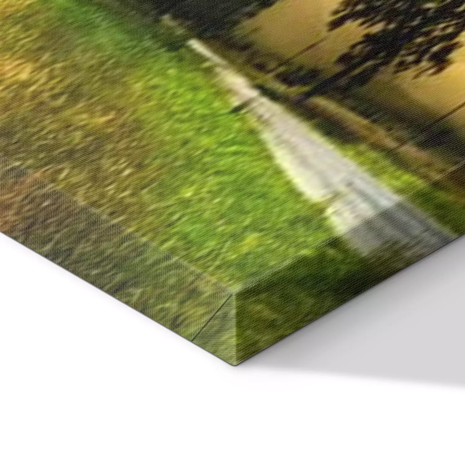De print wordt aangebracht op hoogwaardig canvas dat op een schildersweefgetouw (spieraam) wordt gespannen. Omdat de print de zijranden bedekt, hoeft het ontwerp niet met een extra kader te worden omlijst. Wij raden ook composities aan die uit meerdere foto's bestaan en zo een coherente compositie vormen.