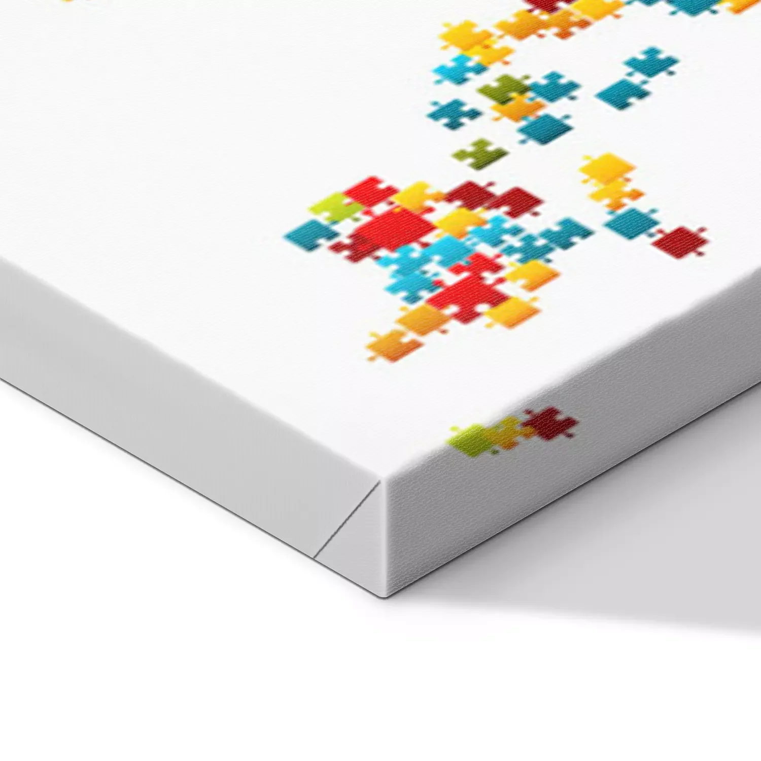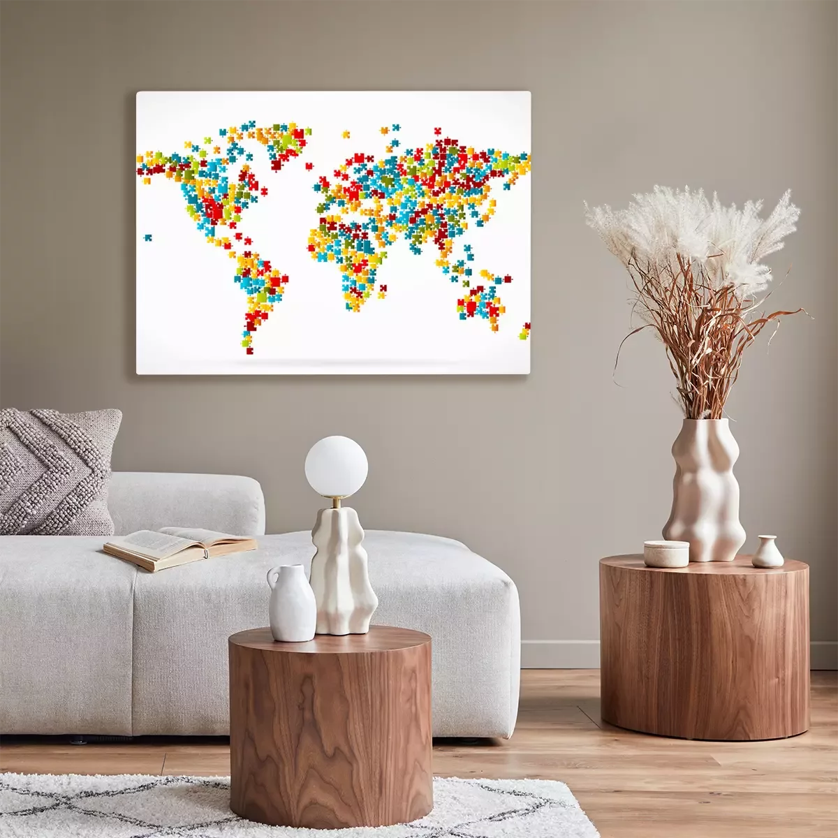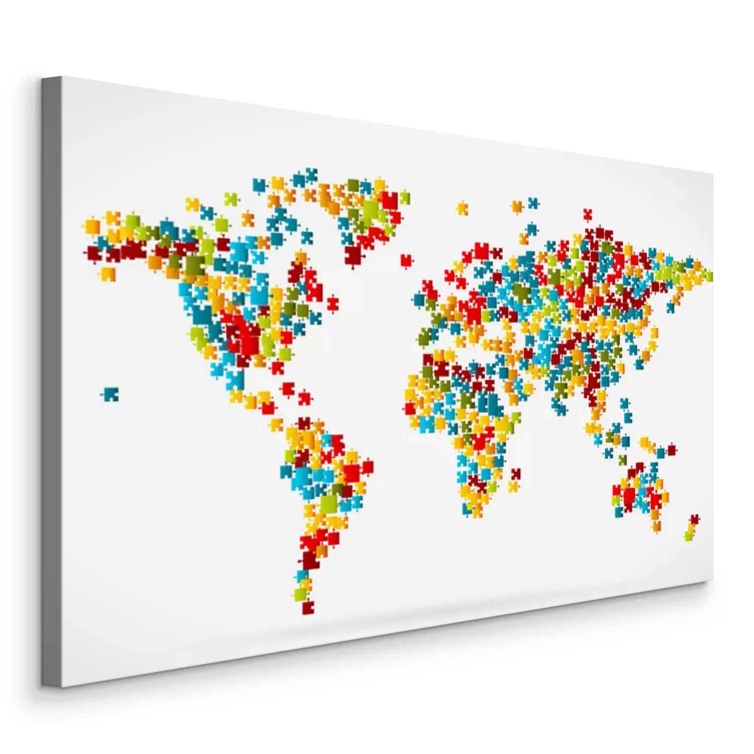 Canvas: Wereldkaart gemaakt van kleurrijke puzzelstukjes