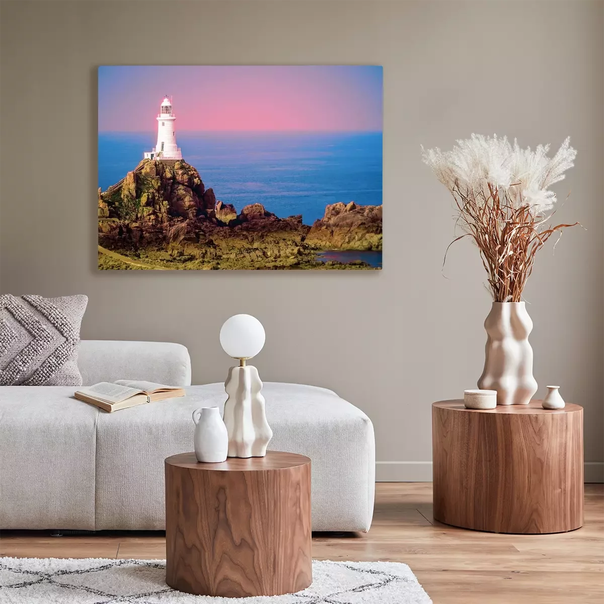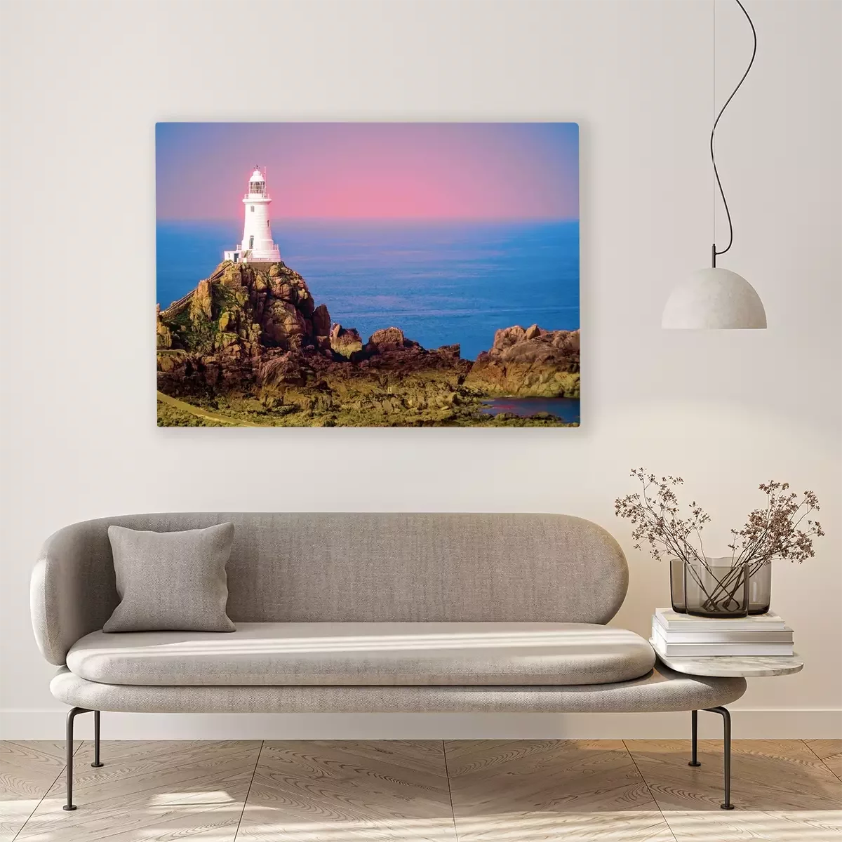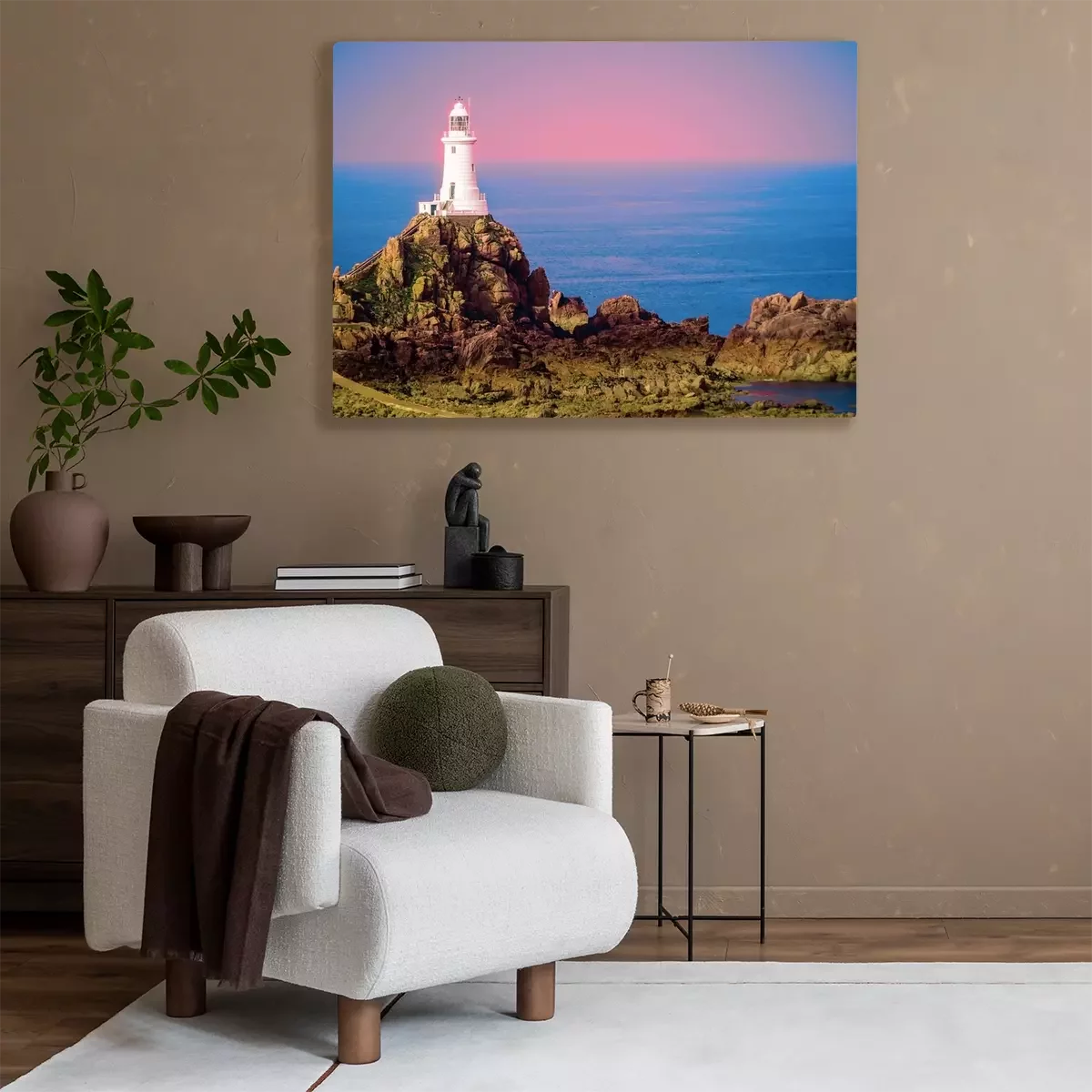 Canvas: White lighthouse on Jersey Island. Image is toned