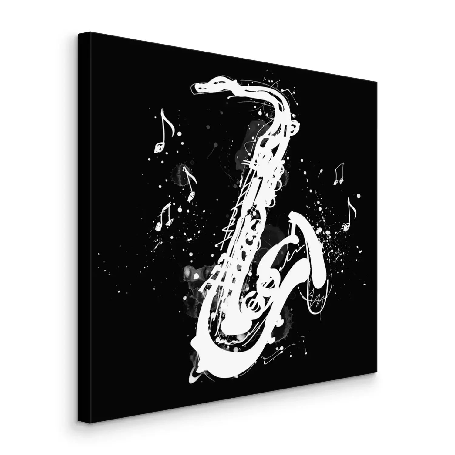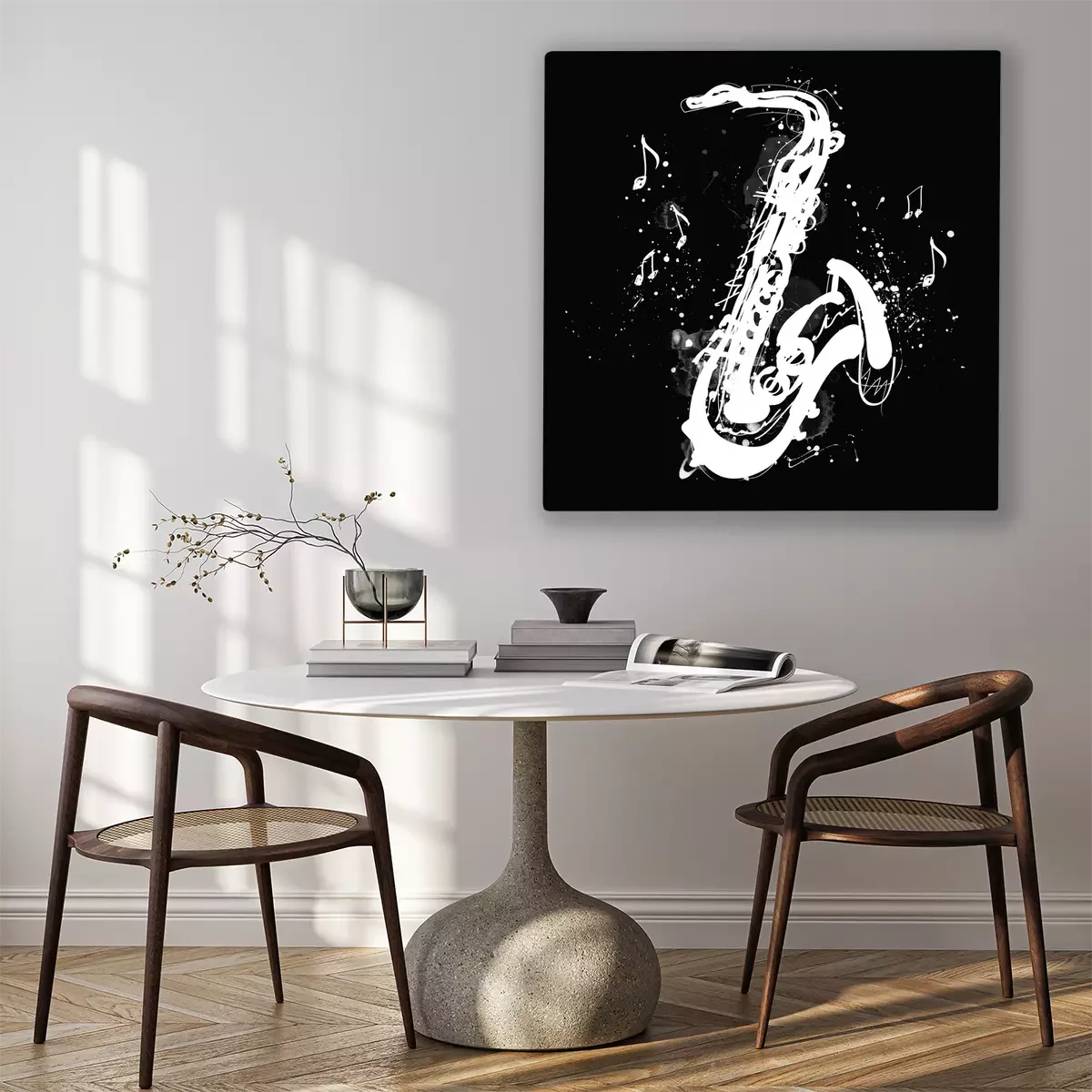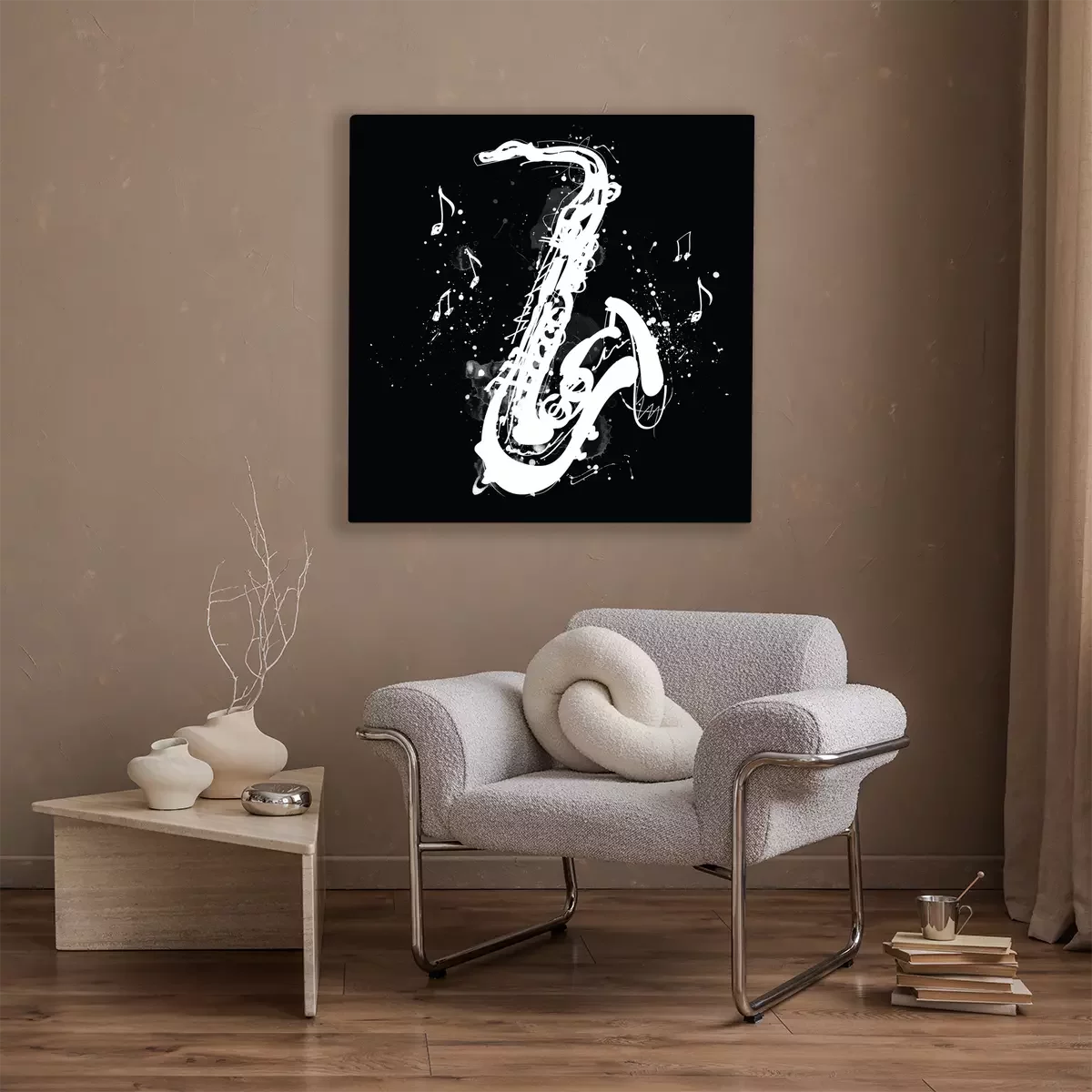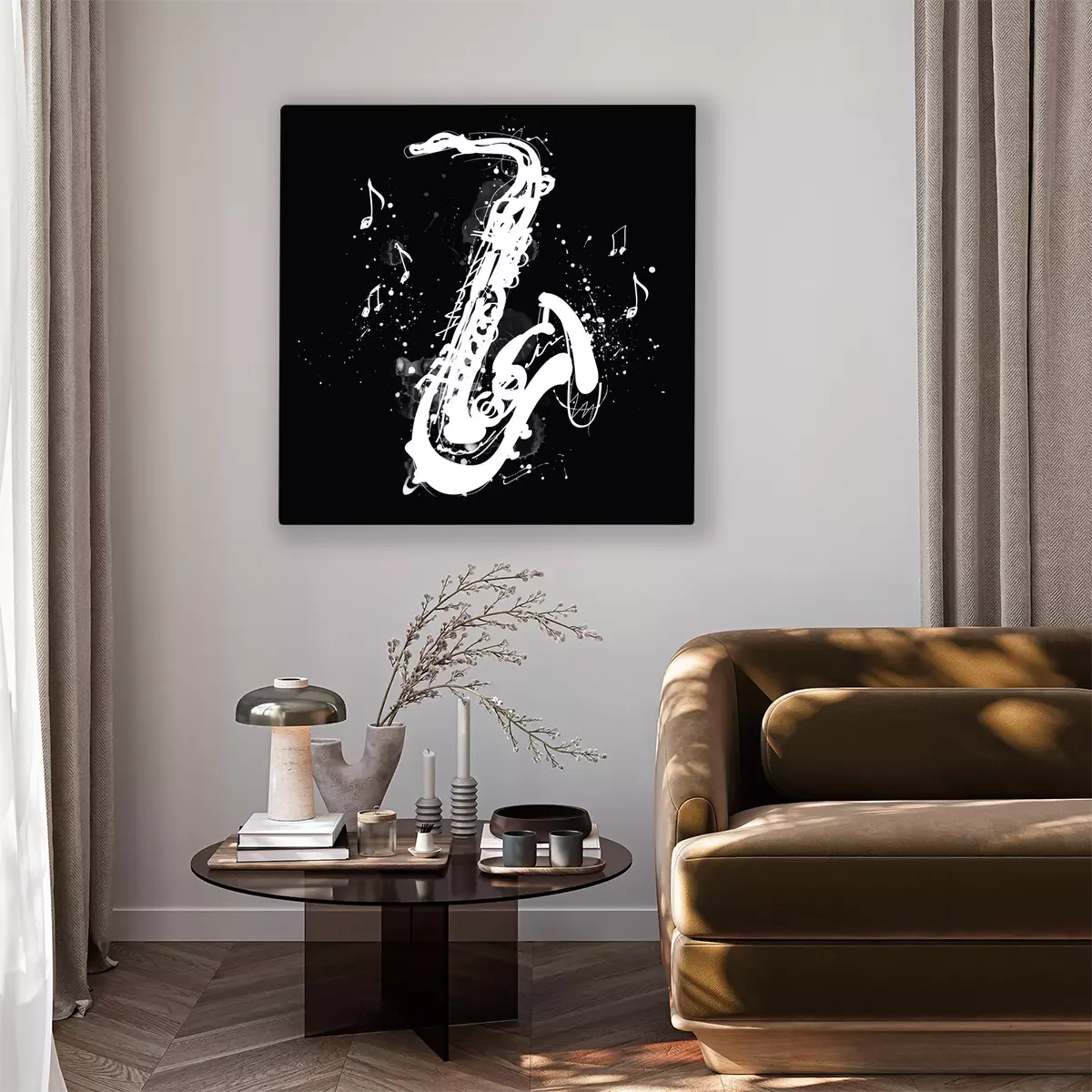 Canvas White silhouette of saxophone with grunge splashes on black background
