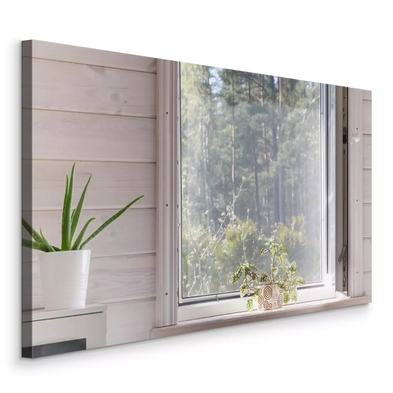 Canvas: White window with mosquito net in a rustic wooden house overlooking the garden.