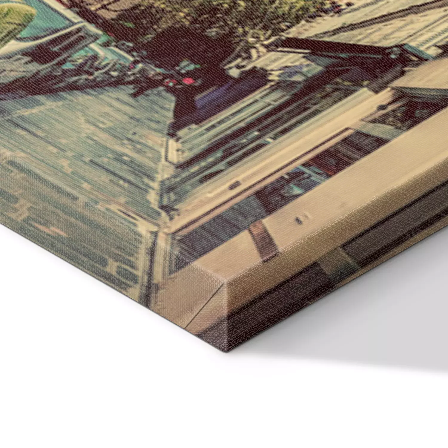 De print wordt aangebracht op hoogwaardig canvas dat op een schildersweefgetouw (spieraam) wordt gespannen. Omdat de print de zijranden bedekt, hoeft het ontwerp niet met een extra kader te worden omlijst. Wij raden ook composities aan die uit meerdere foto's bestaan en zo een coherente compositie vormen.