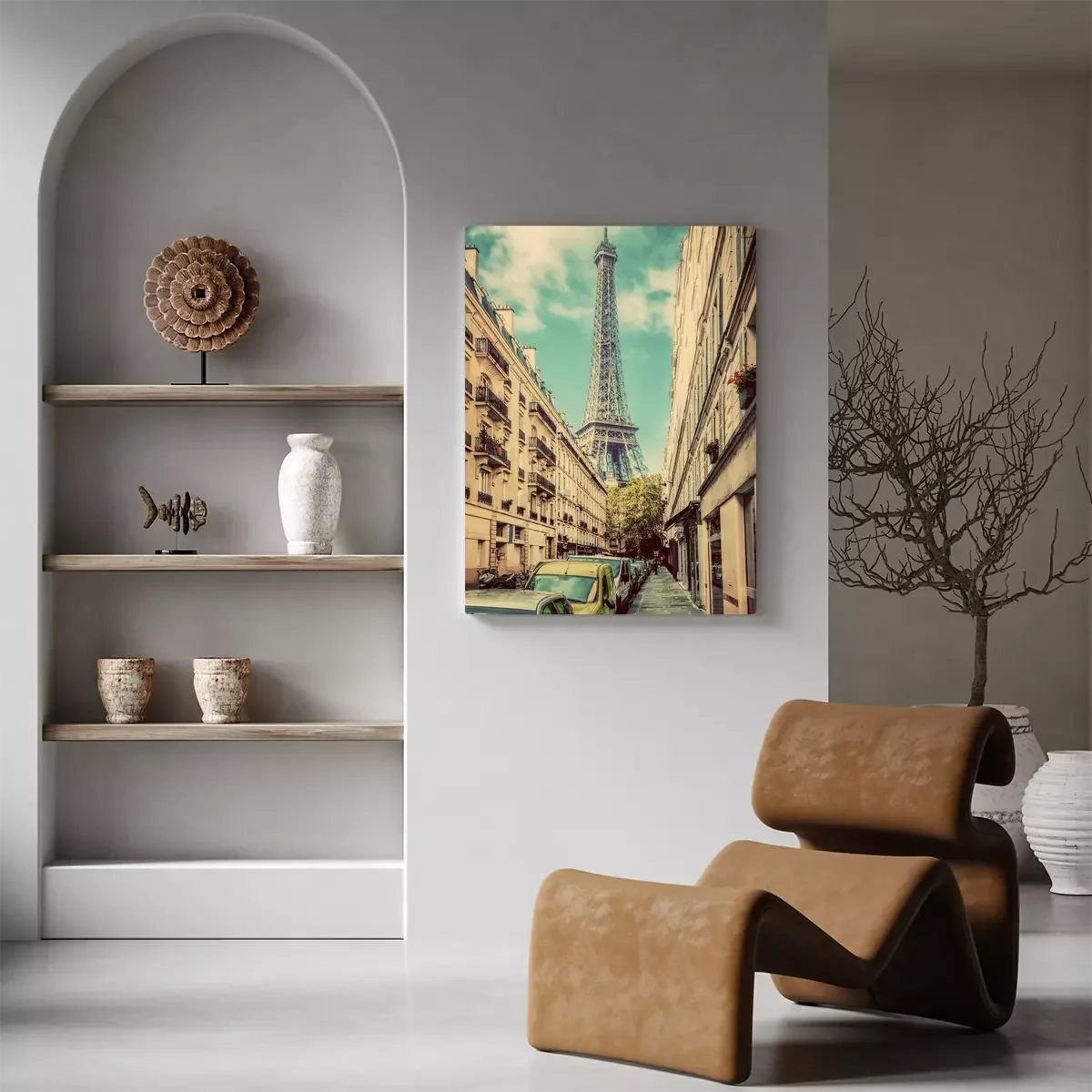 Artistiek Parijs, Frankrijk. Eiffeltoren gezien vanaf de straat met rode retro limousine auto.