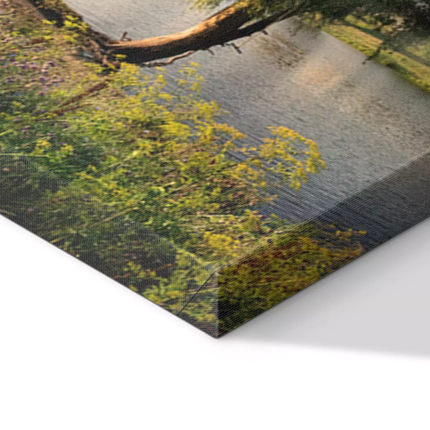 De print wordt aangebracht op hoogwaardig canvas dat op een schildersweefgetouw (spieraam) wordt gespannen. Omdat de print de zijranden bedekt, hoeft het ontwerp niet met een extra kader te worden omlijst. Wij raden ook composities aan die uit meerdere foto's bestaan en zo een coherente compositie vormen.