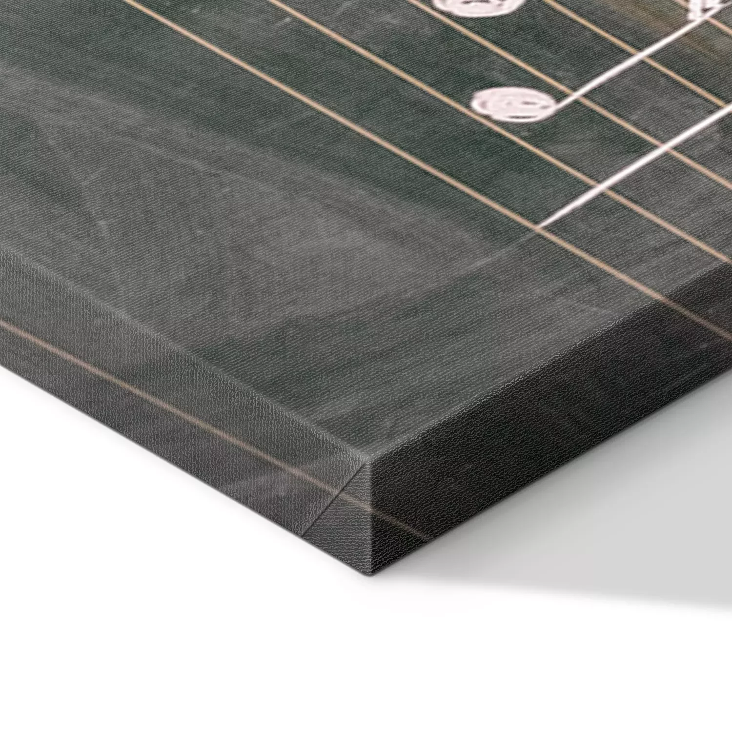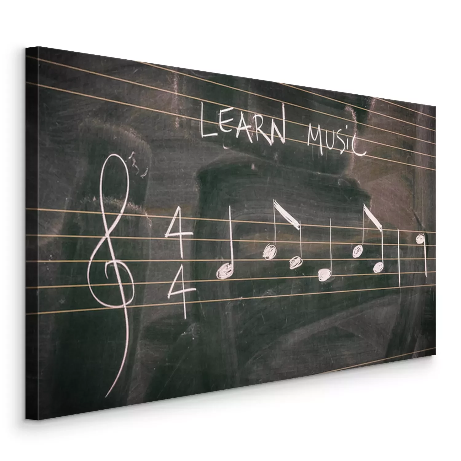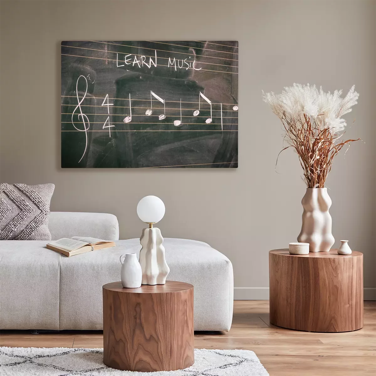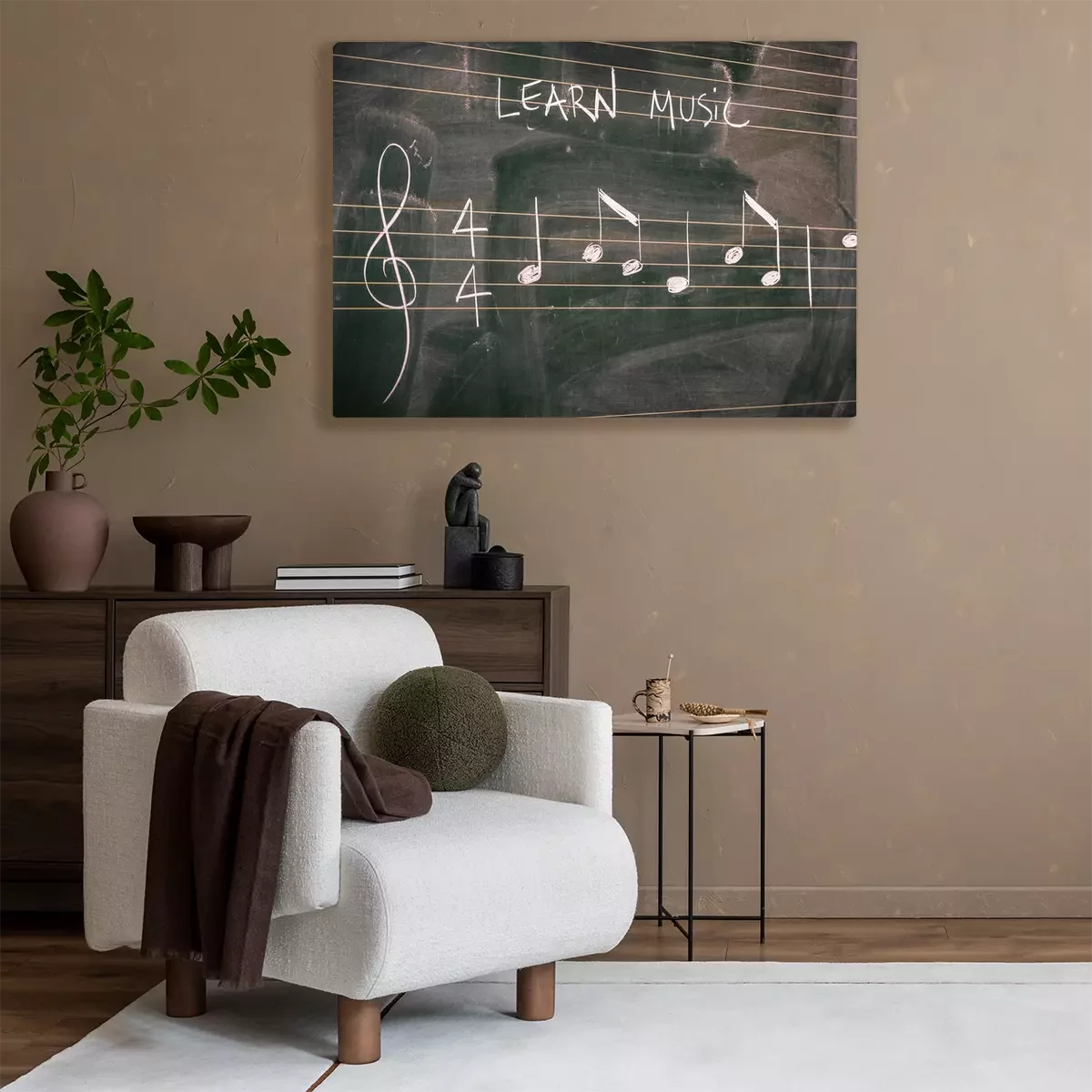 Canvas Willekeurige muzieknota's die met wit krijt op een bord worden geschreven. Leer of geef muziekconcepten.