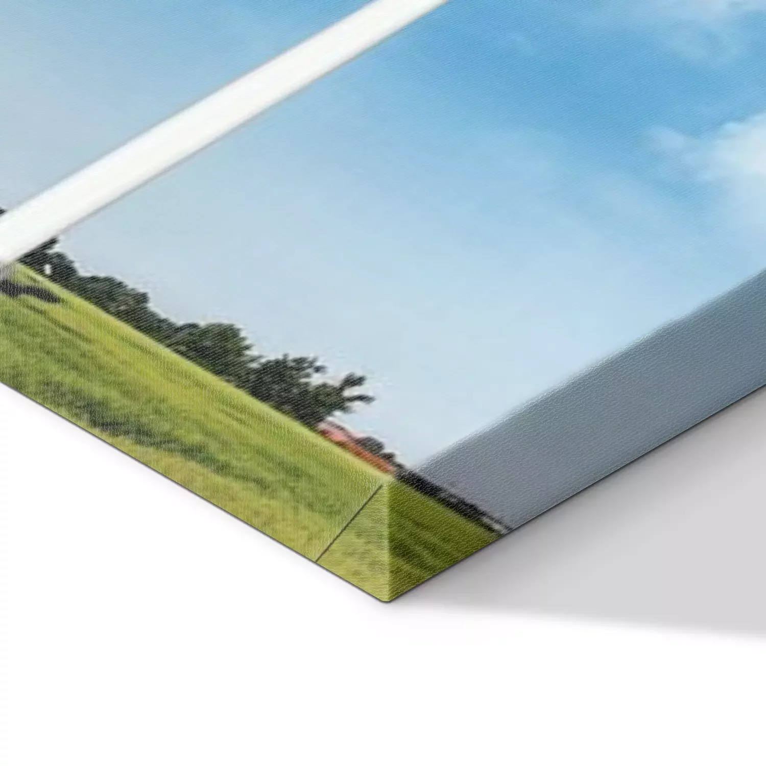 De print wordt aangebracht op hoogwaardig canvas dat op een schildersweefgetouw (spieraam) wordt gespannen. Omdat de print de zijranden bedekt, hoeft het ontwerp niet met een extra kader te worden omlijst. Wij raden ook composities aan die uit meerdere foto's bestaan en zo een coherente compositie vormen.