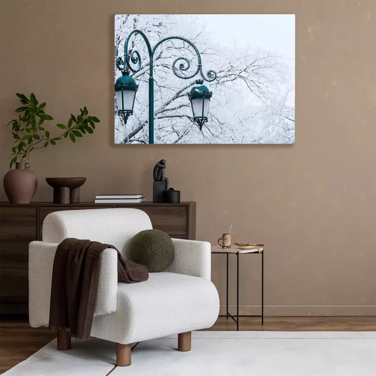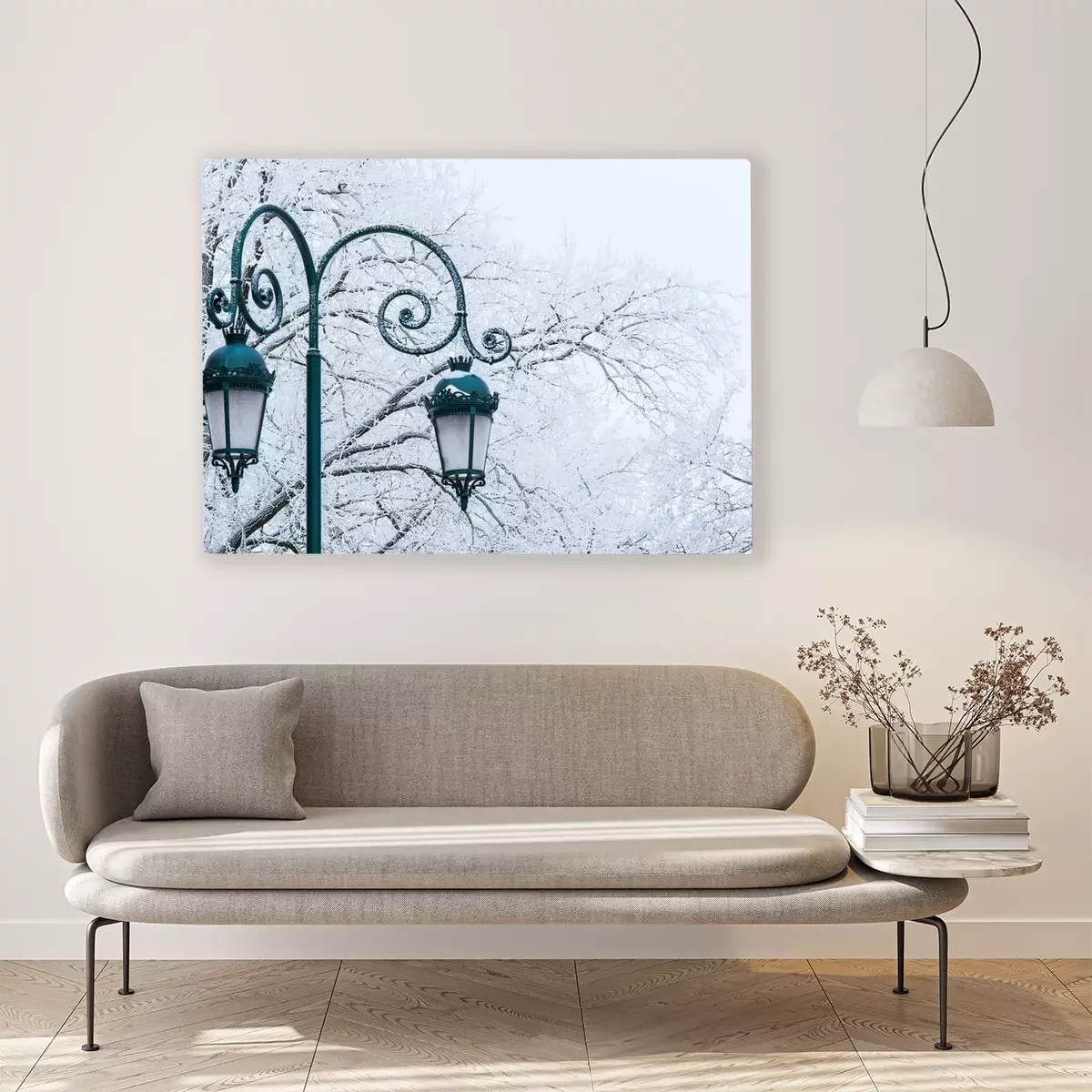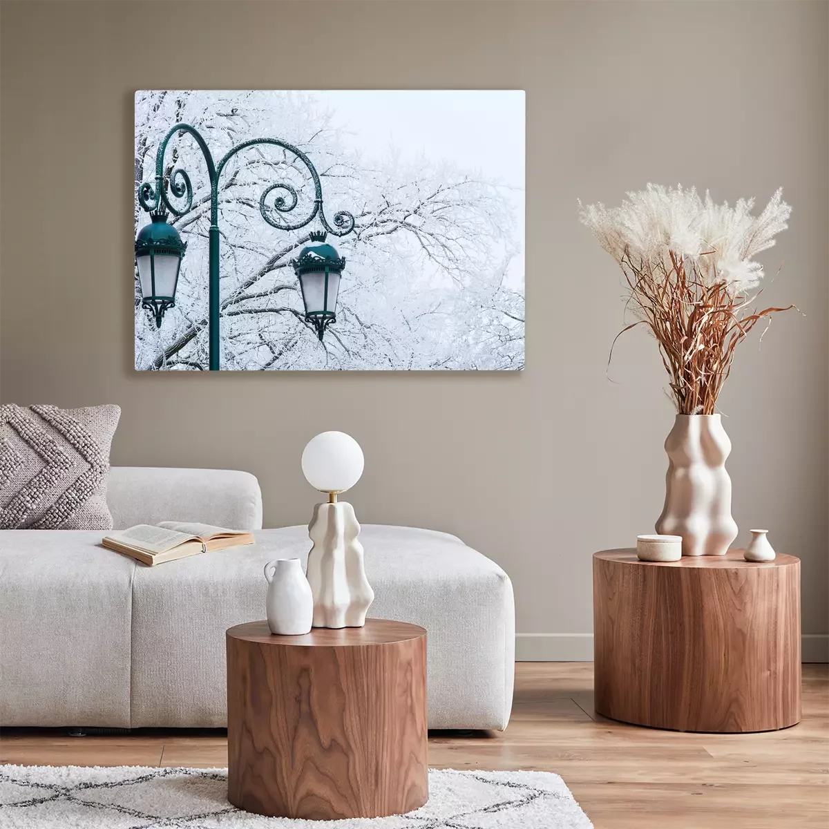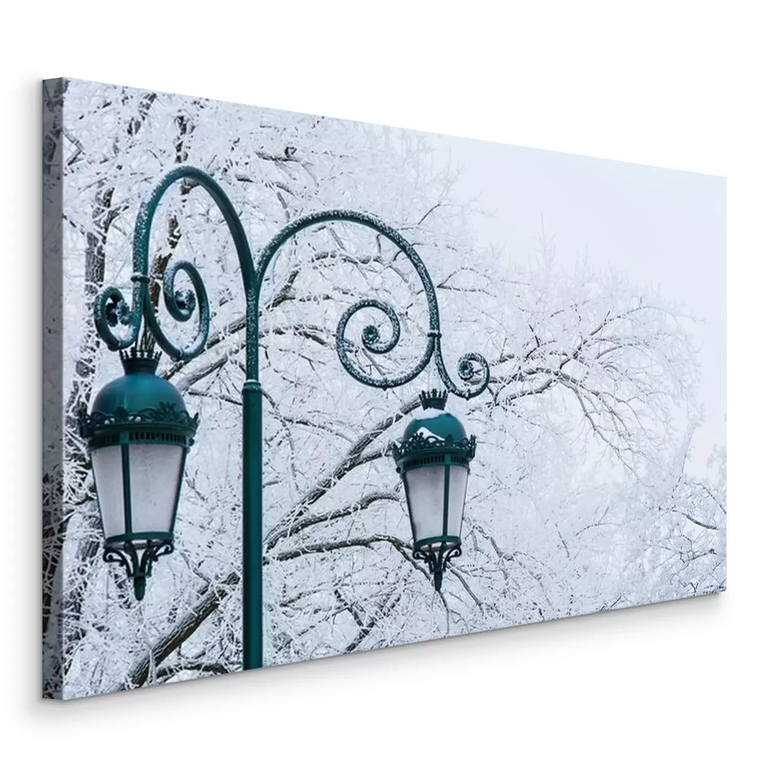 Canvas: Winterlandschap met ijzig winter bomen en straatverlichting