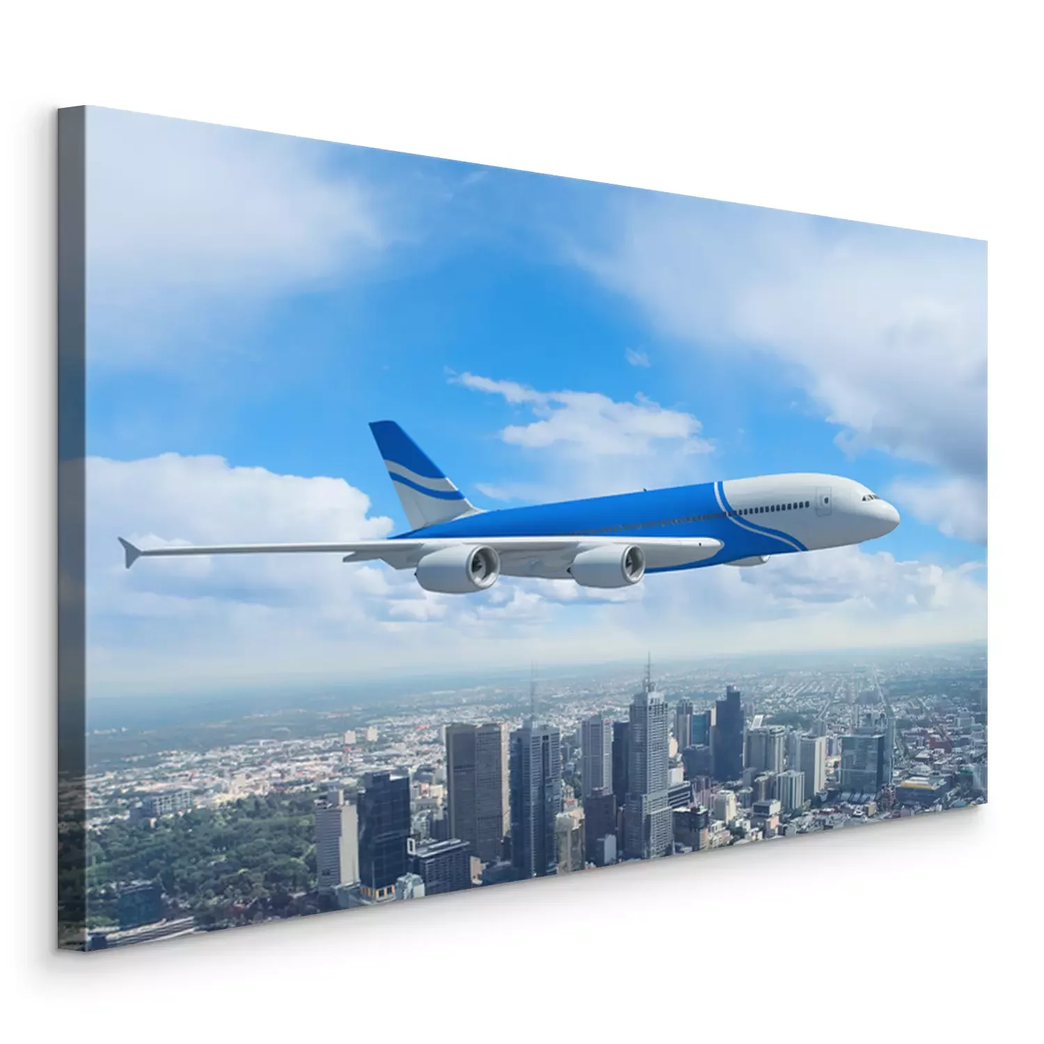 Canvas Wit passagiersvliegtuig vliegen boven een stad