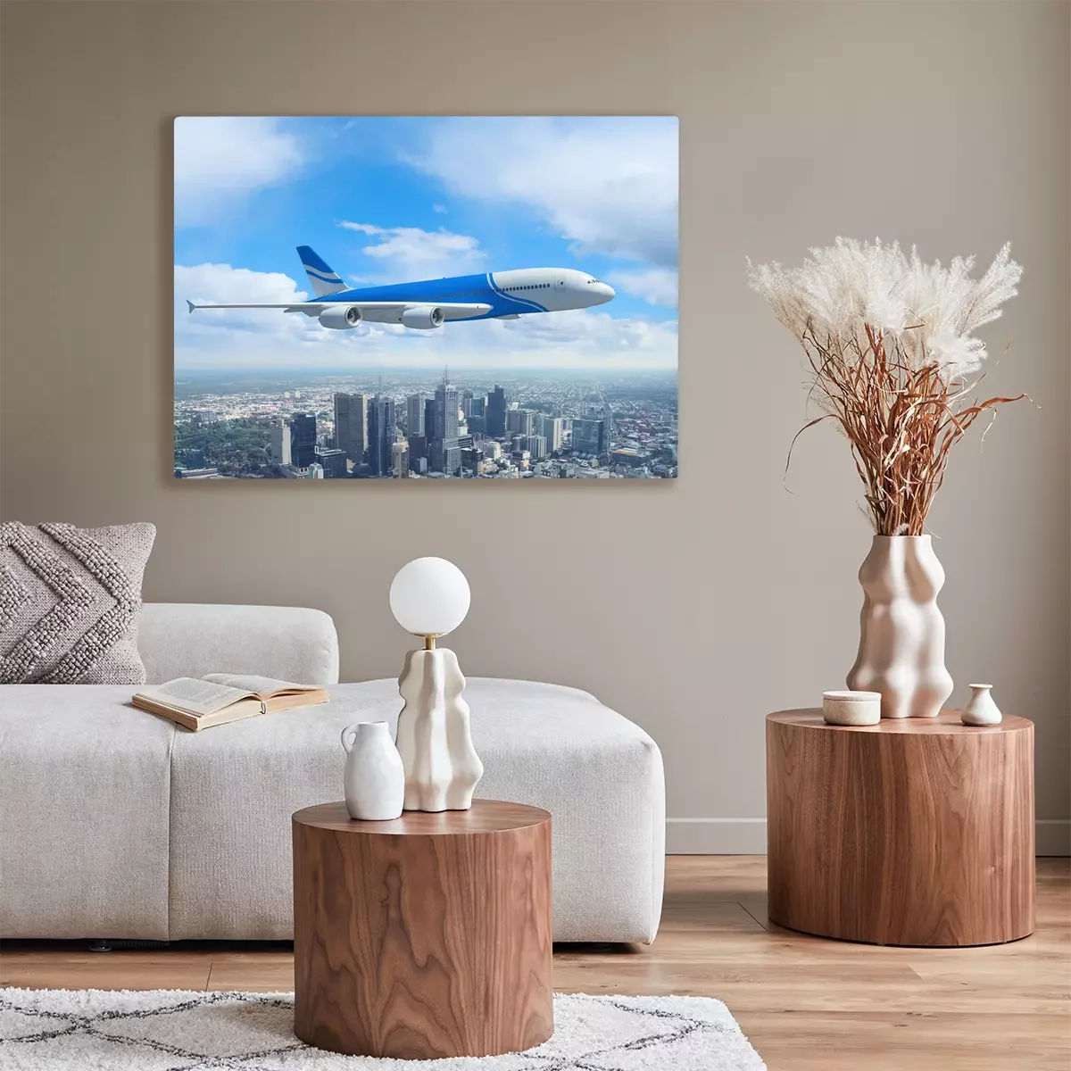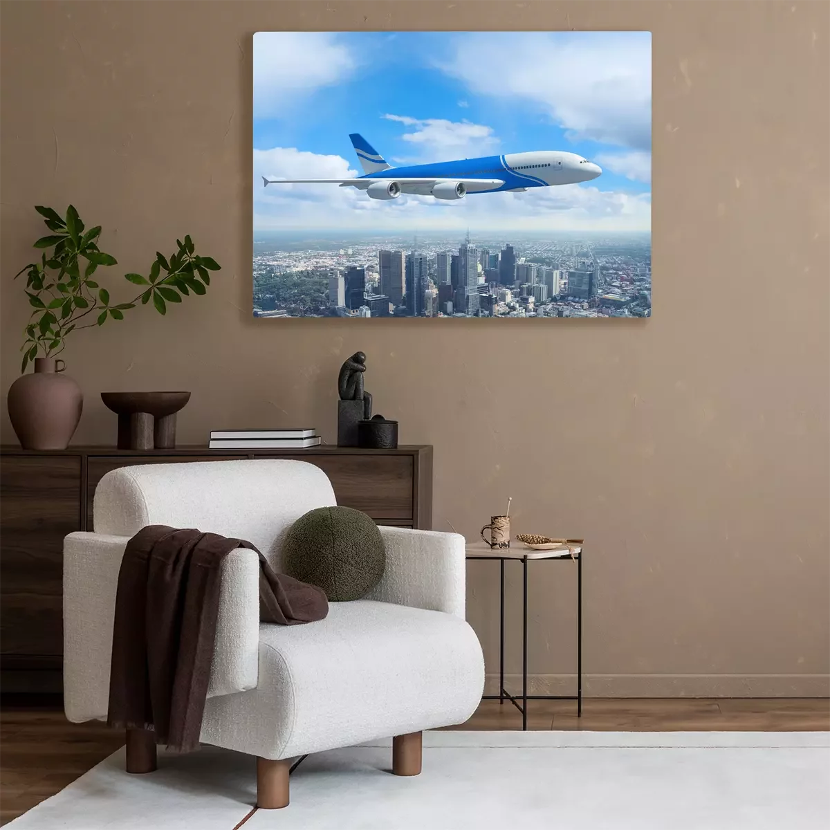 Canvas: Wit passagiersvliegtuig vliegen boven een stad