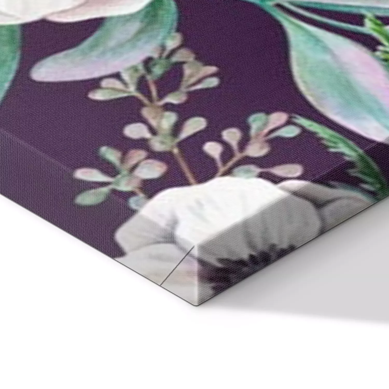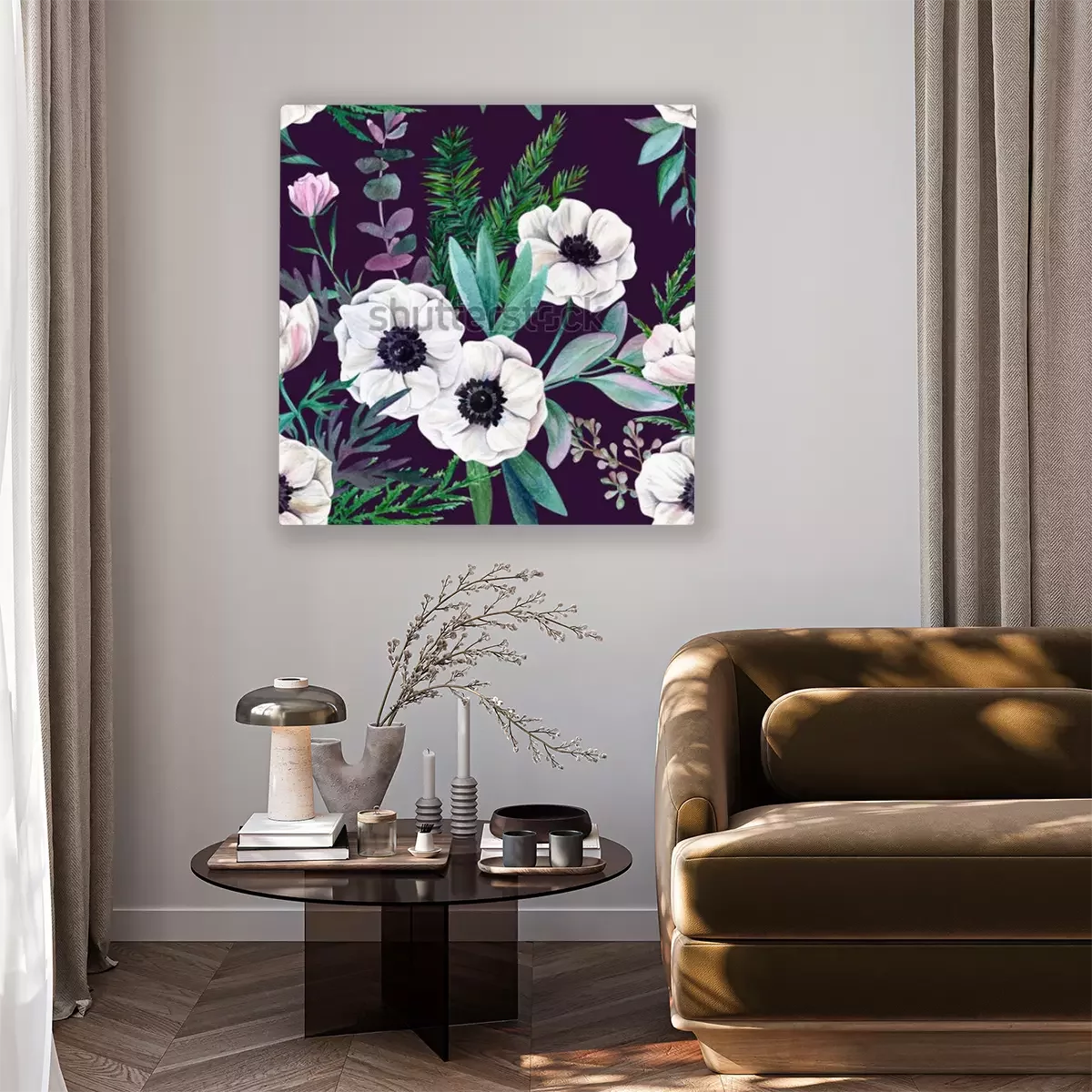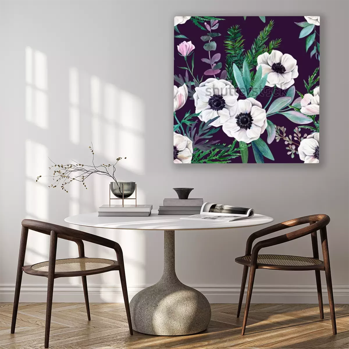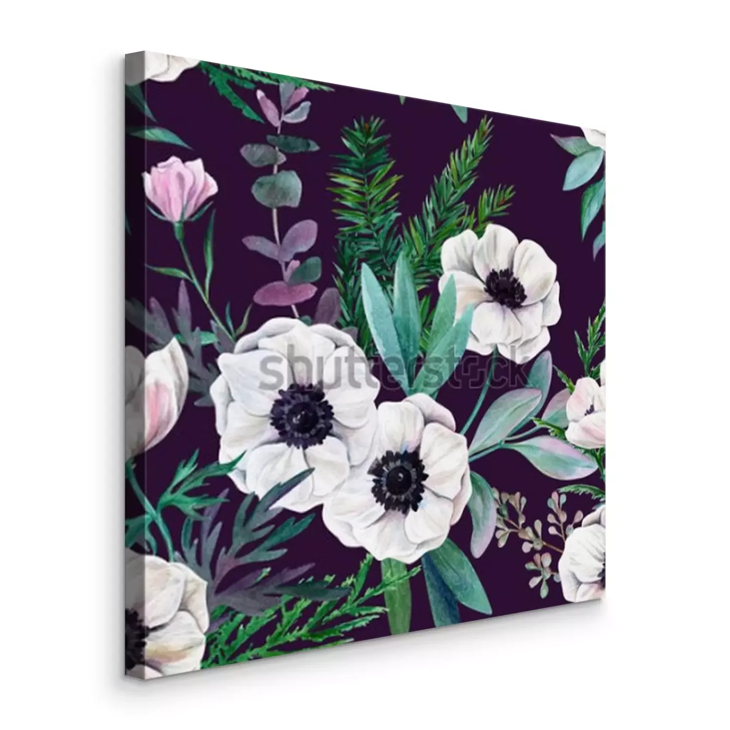 Canvas: Witte anemonen en bladeren op paarse achtergrond. Waterverf naadloos patroon, volledige kleur, hand getrokken illustratie.