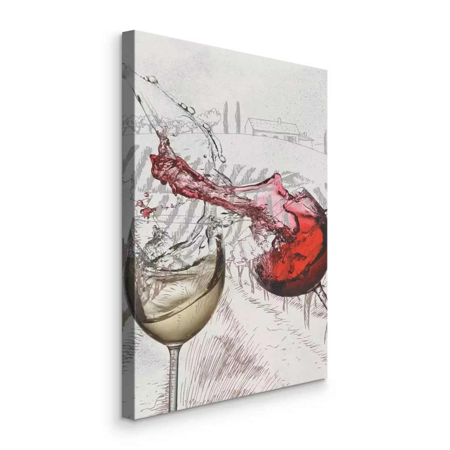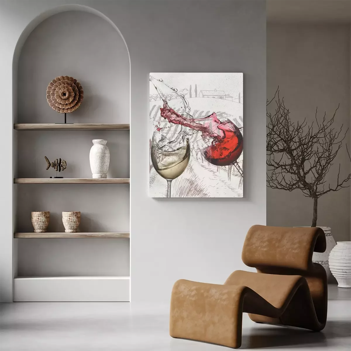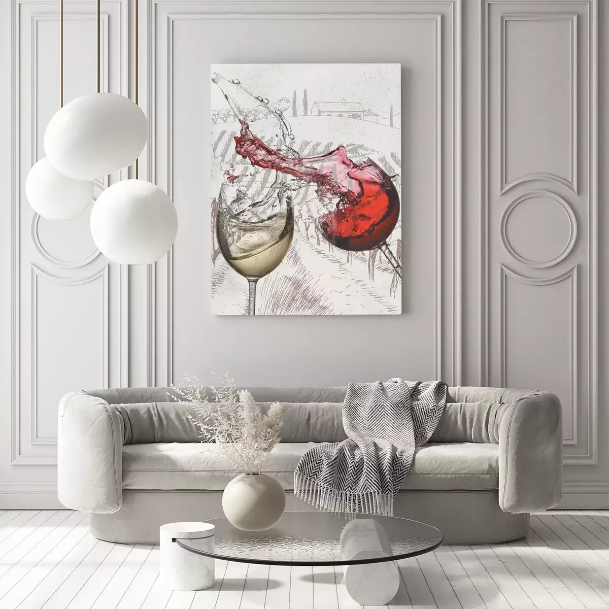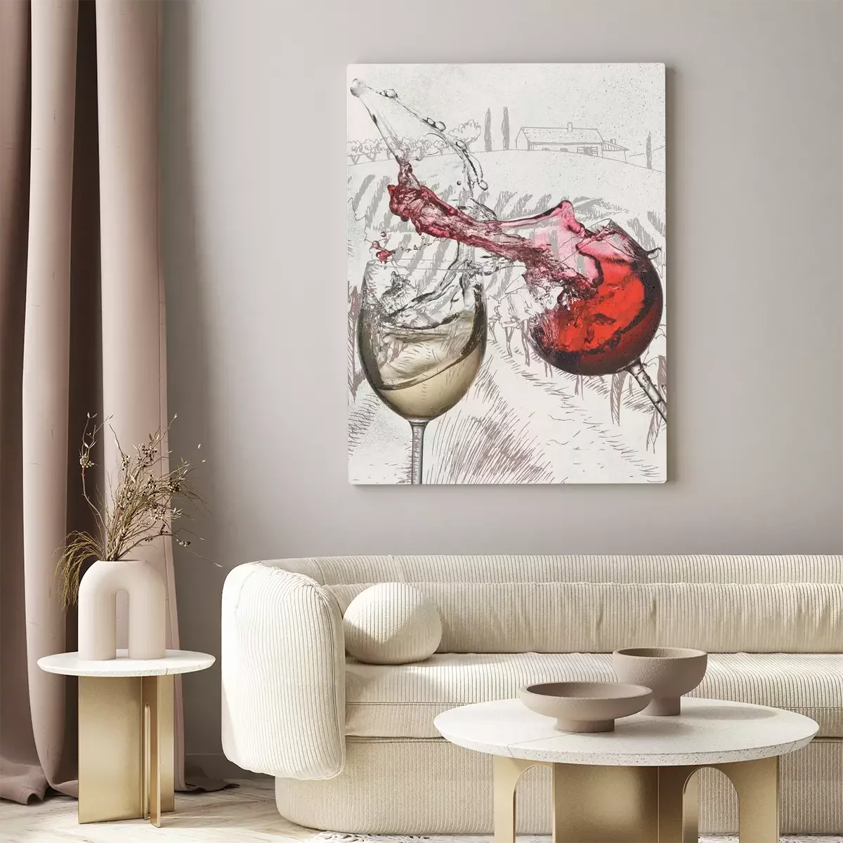 Witte en rode wijn in glazen met uitzicht op het landschap