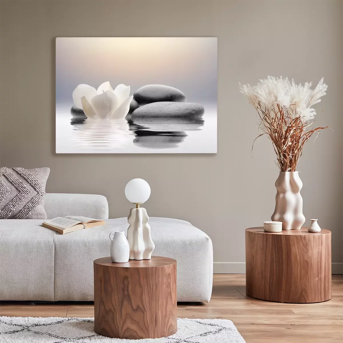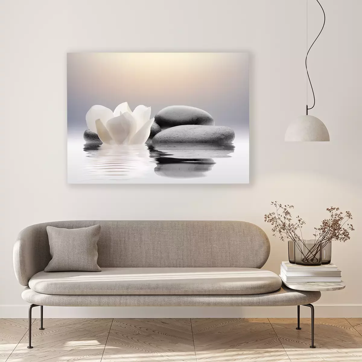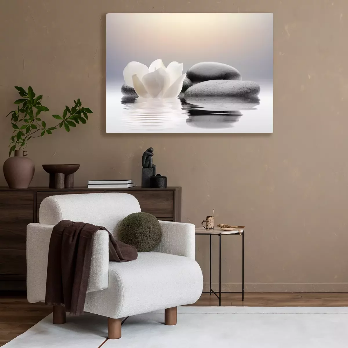 Witte magnoliabloem en stenen met weerspiegeling in water