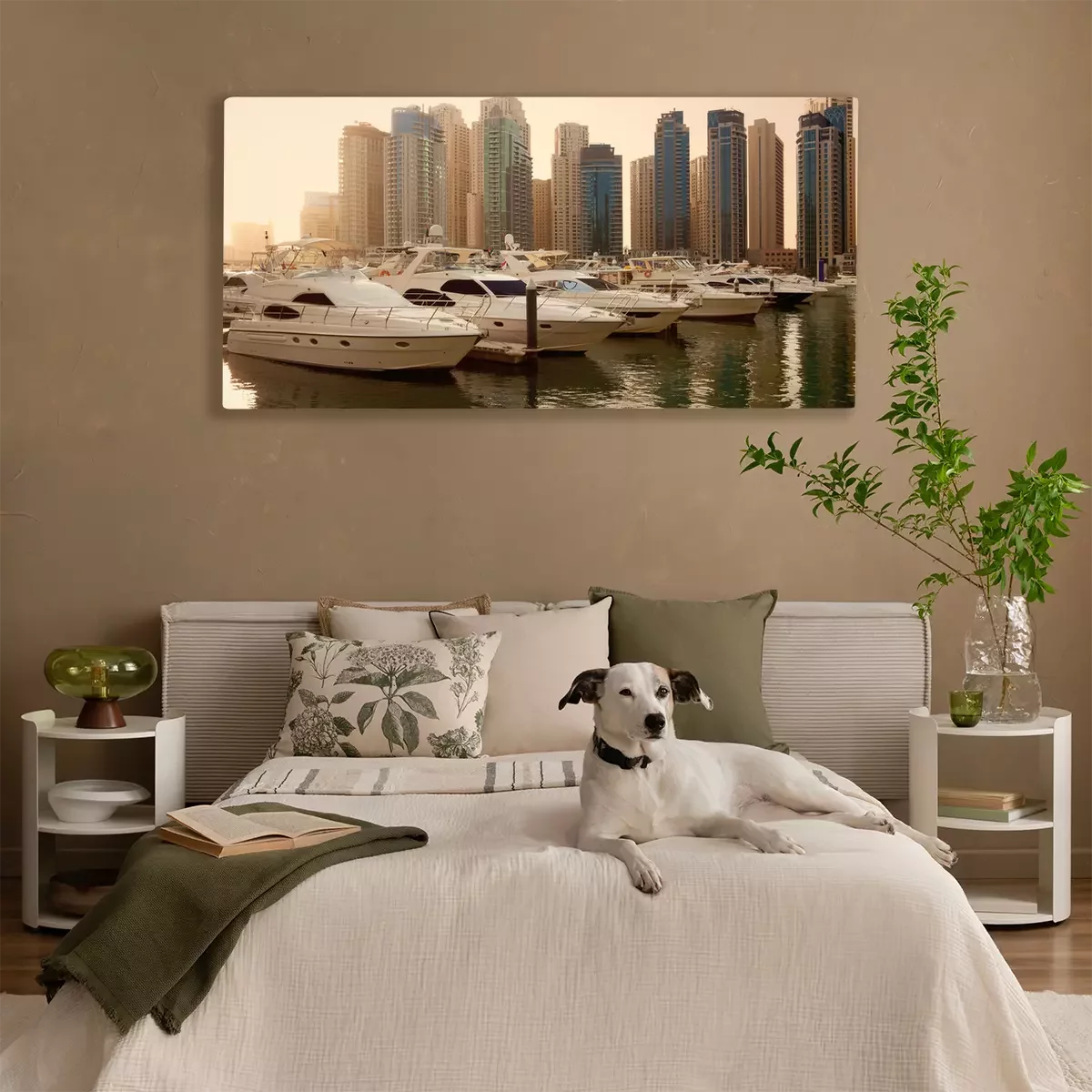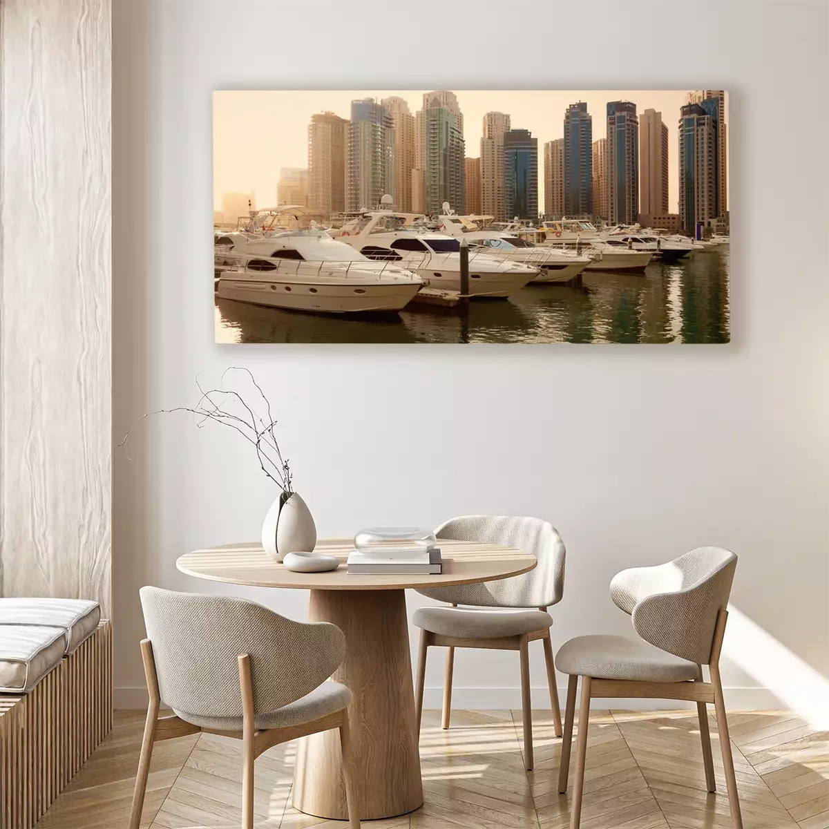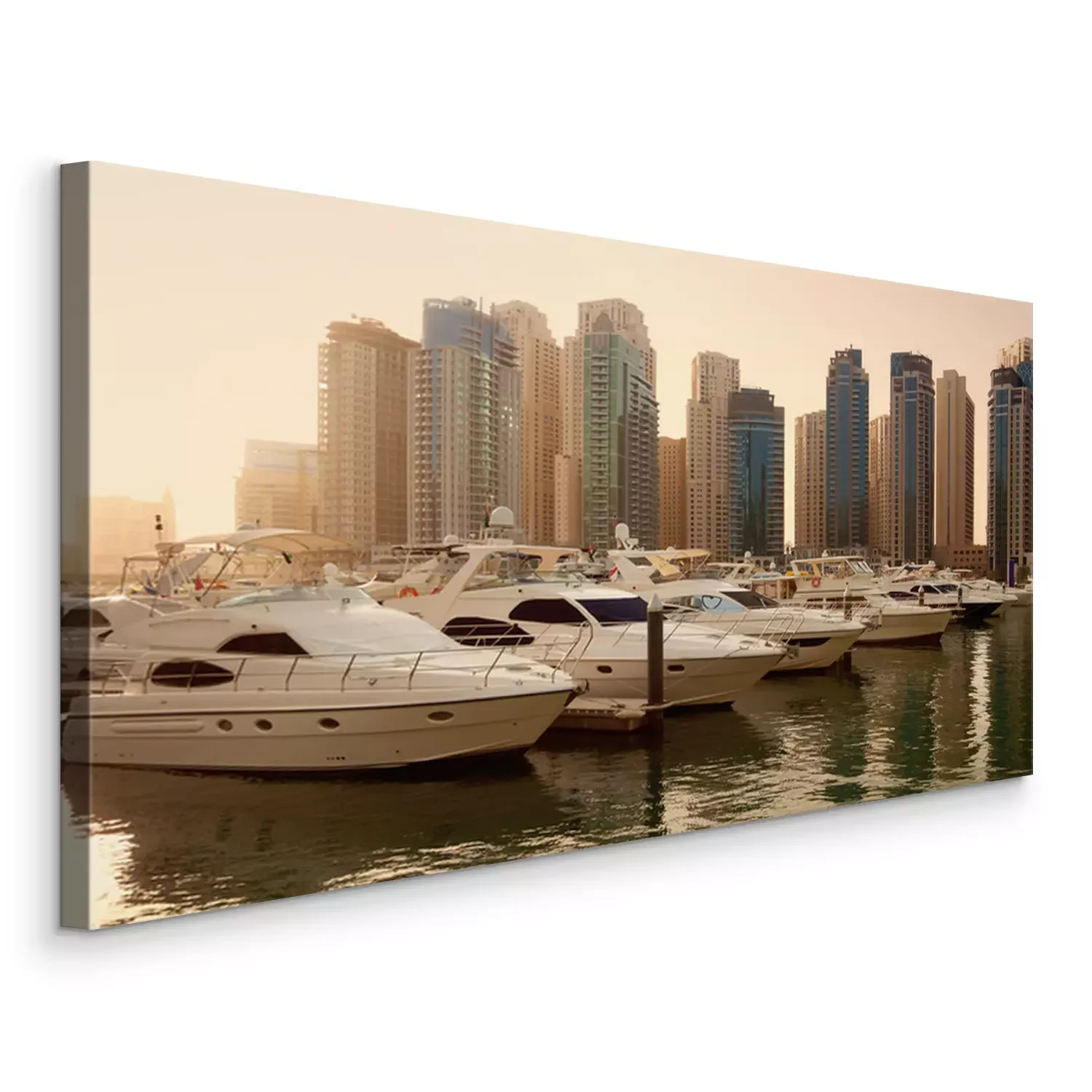 Canvas: Wolkenkrabbers en Jachten in Dubai Marina Tijdens Zonsondergang