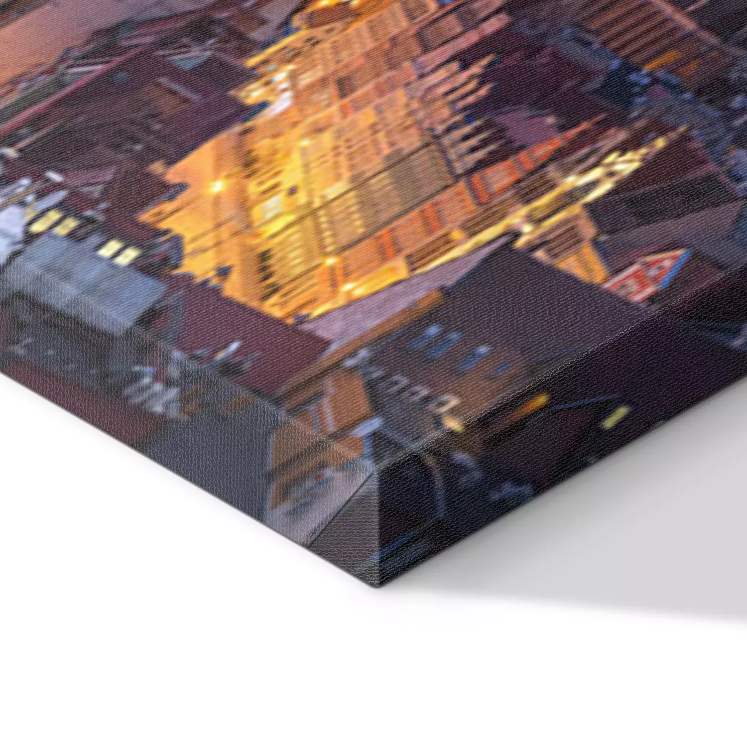 De print wordt aangebracht op hoogwaardig canvas dat op een schildersweefgetouw (spieraam) wordt gespannen. Omdat de print de zijranden bedekt, hoeft het ontwerp niet met een extra kader te worden omlijst. Wij raden ook composities aan die uit meerdere foto's bestaan en zo een coherente compositie vormen.