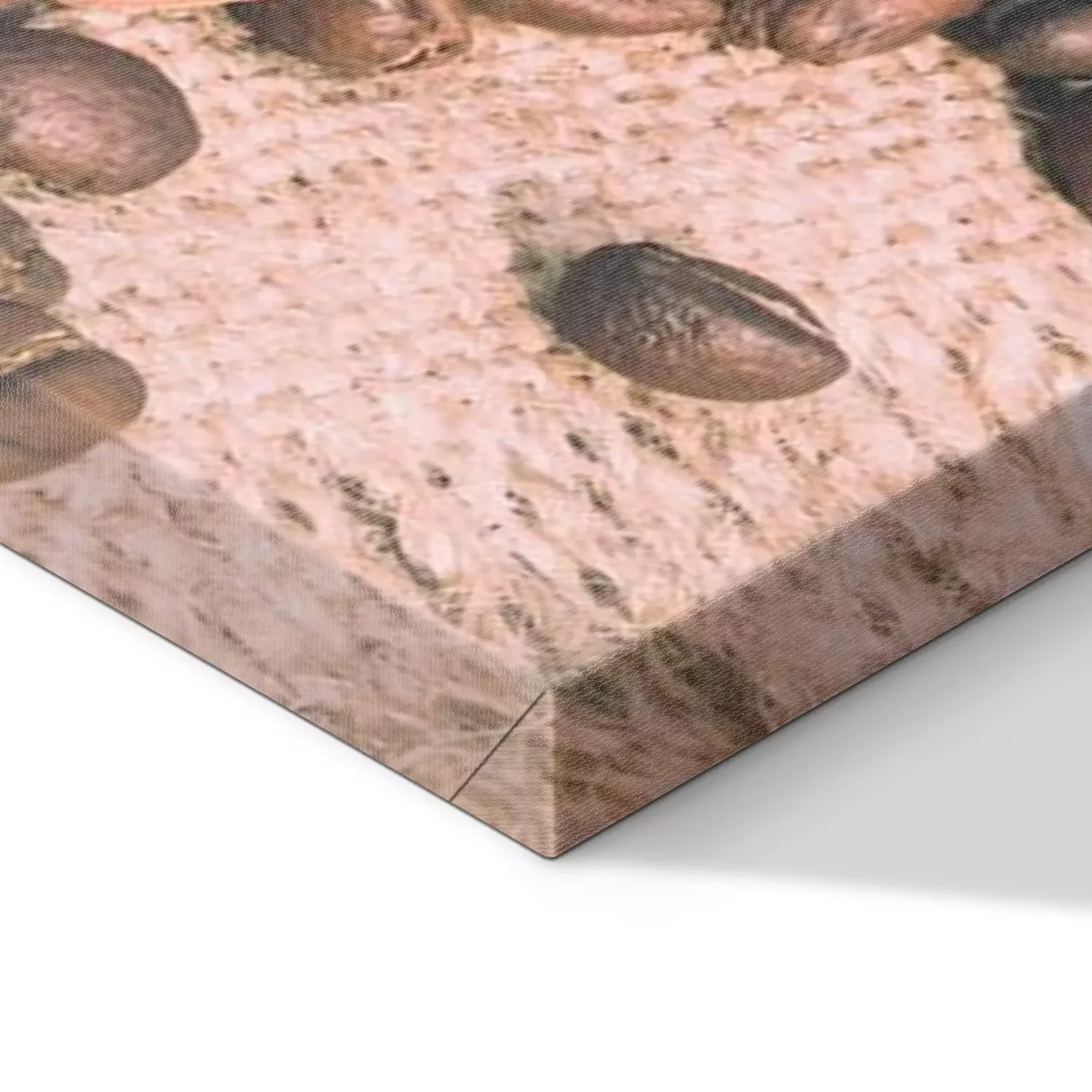 De print wordt aangebracht op hoogwaardig canvas dat op een schildersweefgetouw (spieraam) wordt gespannen. Omdat de print de zijranden bedekt, hoeft het ontwerp niet met een extra kader te worden omlijst. Wij raden ook composities aan die uit meerdere foto's bestaan en zo een coherente compositie vormen.
