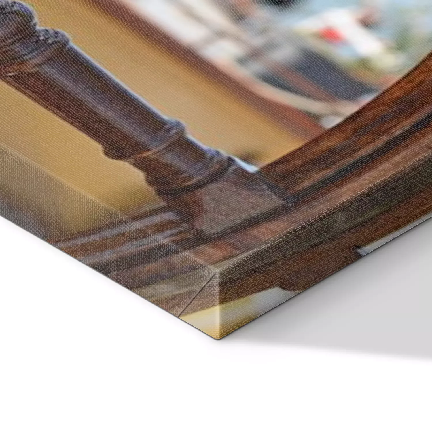 De print wordt aangebracht op hoogwaardig canvas dat op een schildersweefgetouw (spieraam) wordt gespannen. Omdat de print de zijranden bedekt, hoeft het ontwerp niet met een extra kader te worden omlijst. Wij raden ook composities aan die uit meerdere foto's bestaan en zo een coherente compositie vormen.