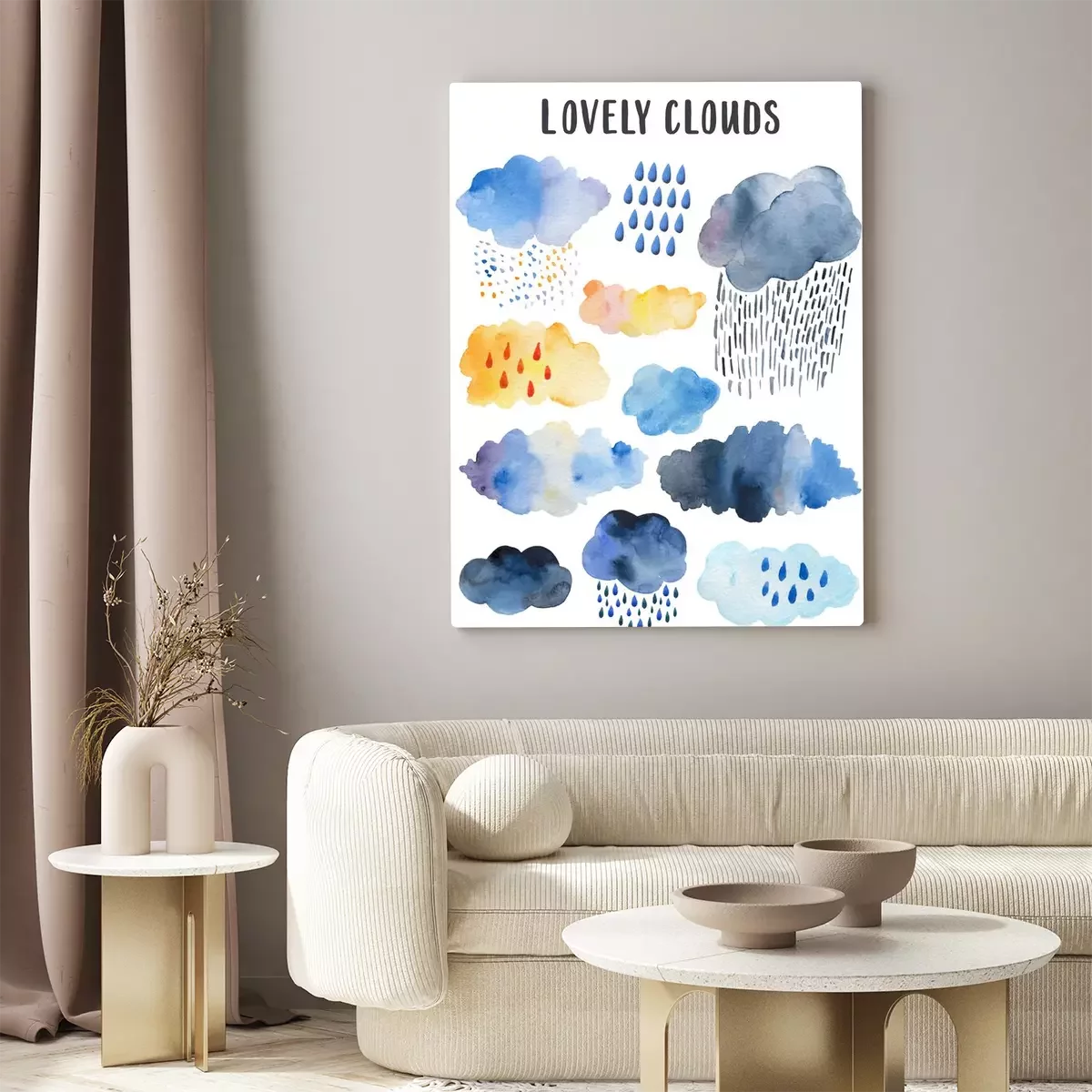 Canvas: Yellow rainy cloud. Scandinavian poster for children's room decor