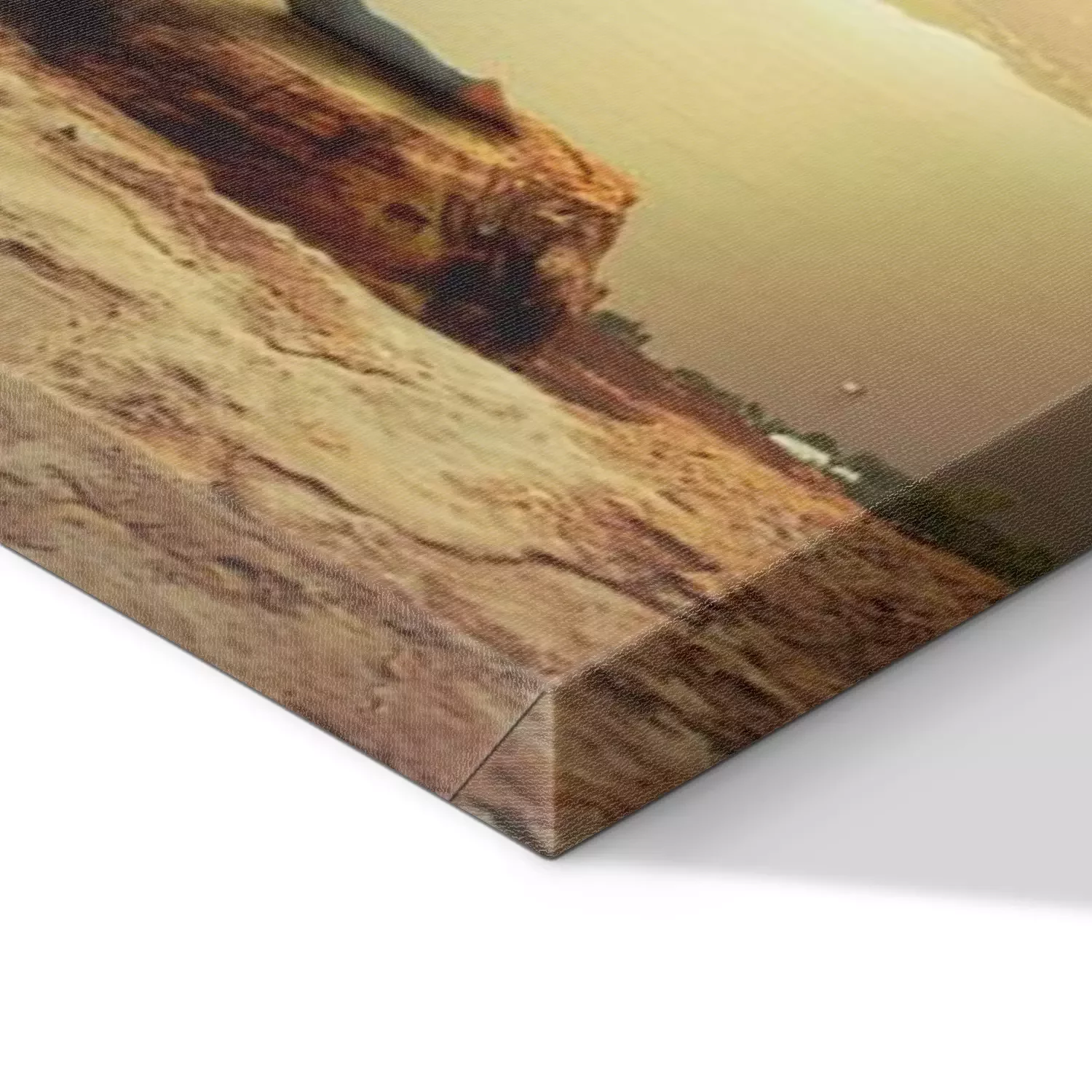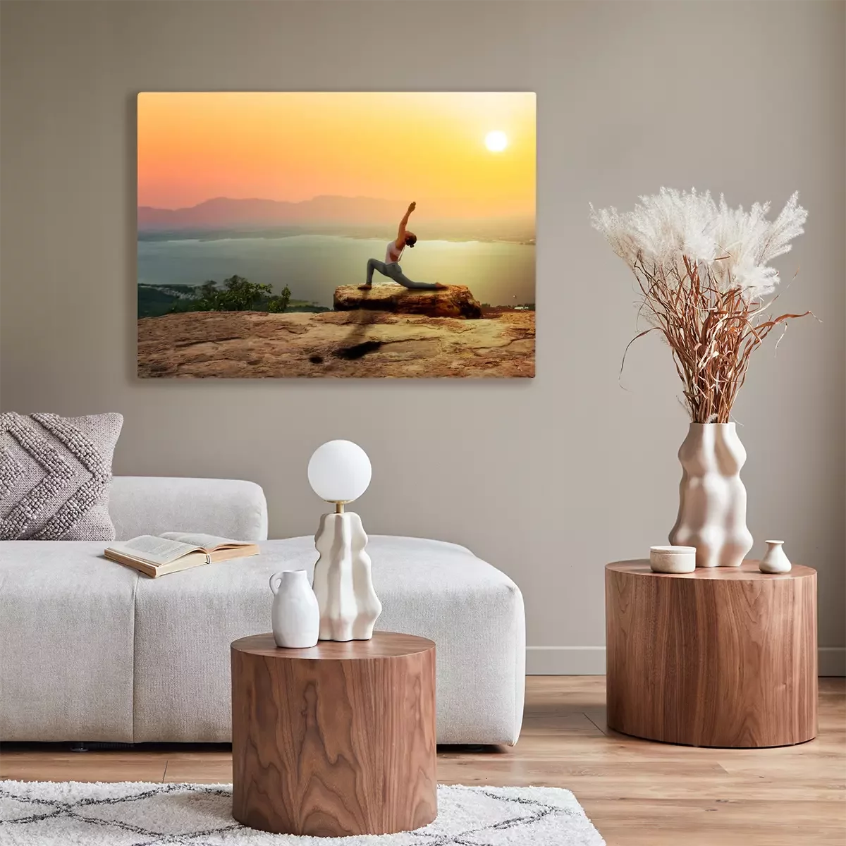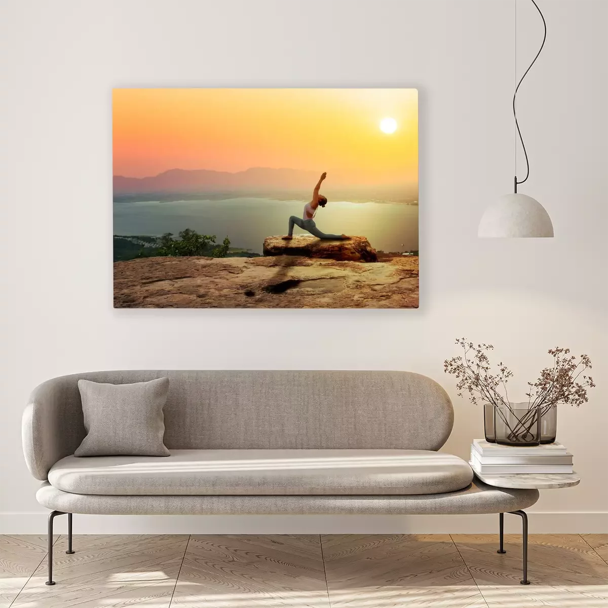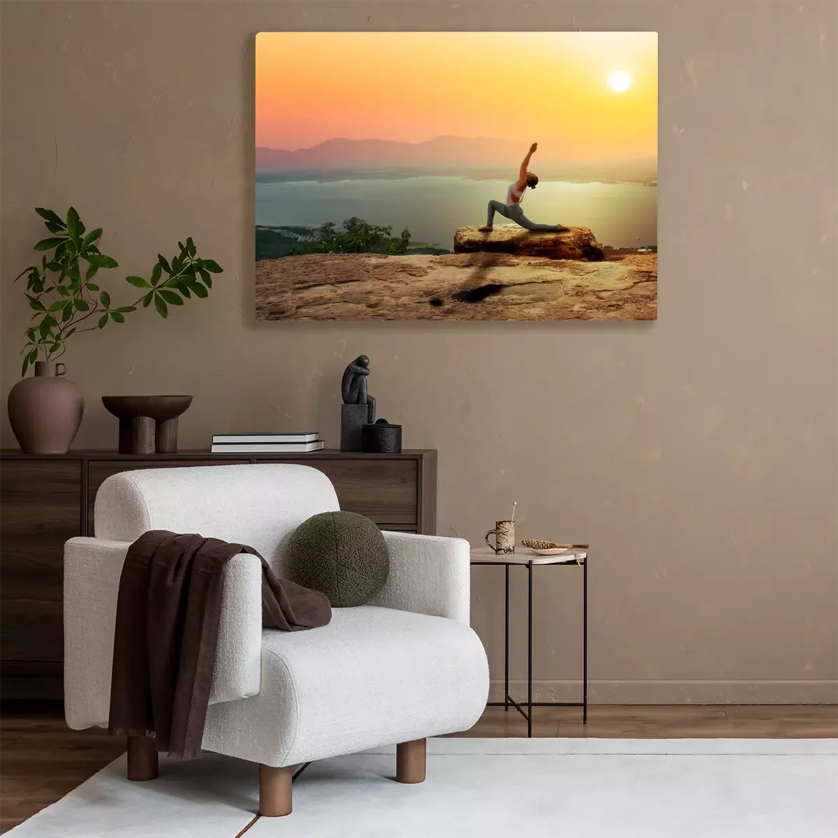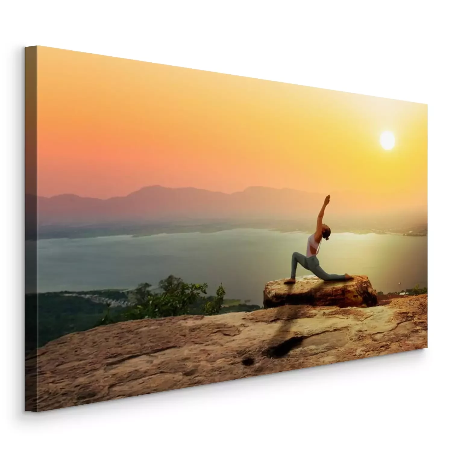 Canvas Yoga bij zonsopgang met berglandschap op de achtergrond