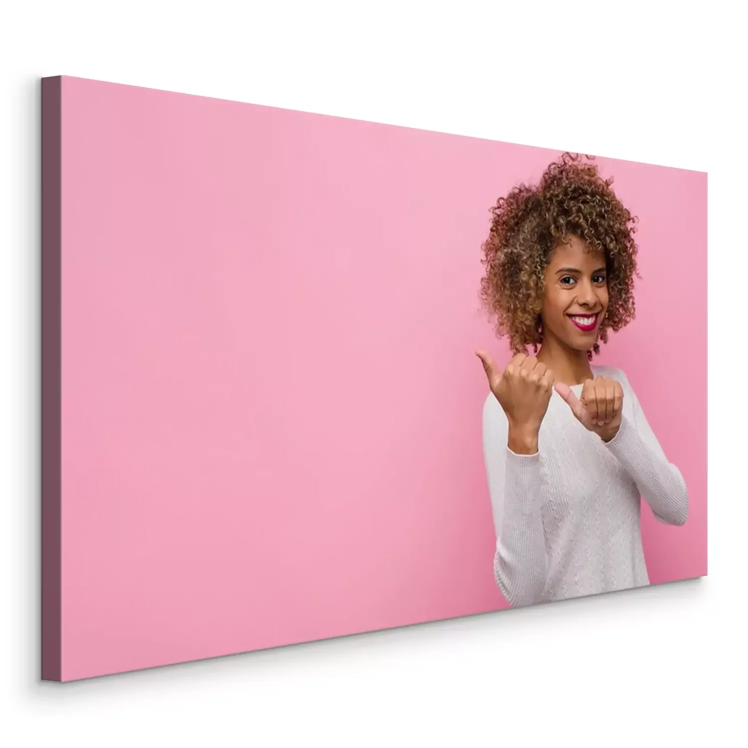 Canvas young african american woman smiling cheerfully and casually pointing to copy space on the side, feeling happy and satisfied against pink wall