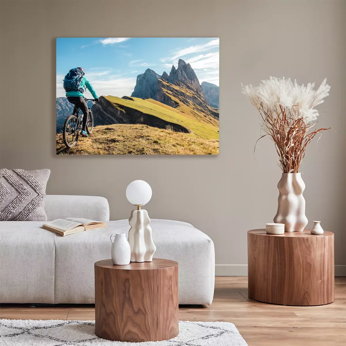 Canvas: Young man with mountain bike cycling on Seceda mountain peak at sunrise. Puez Odle, Trentino, Dolomites, Italy.