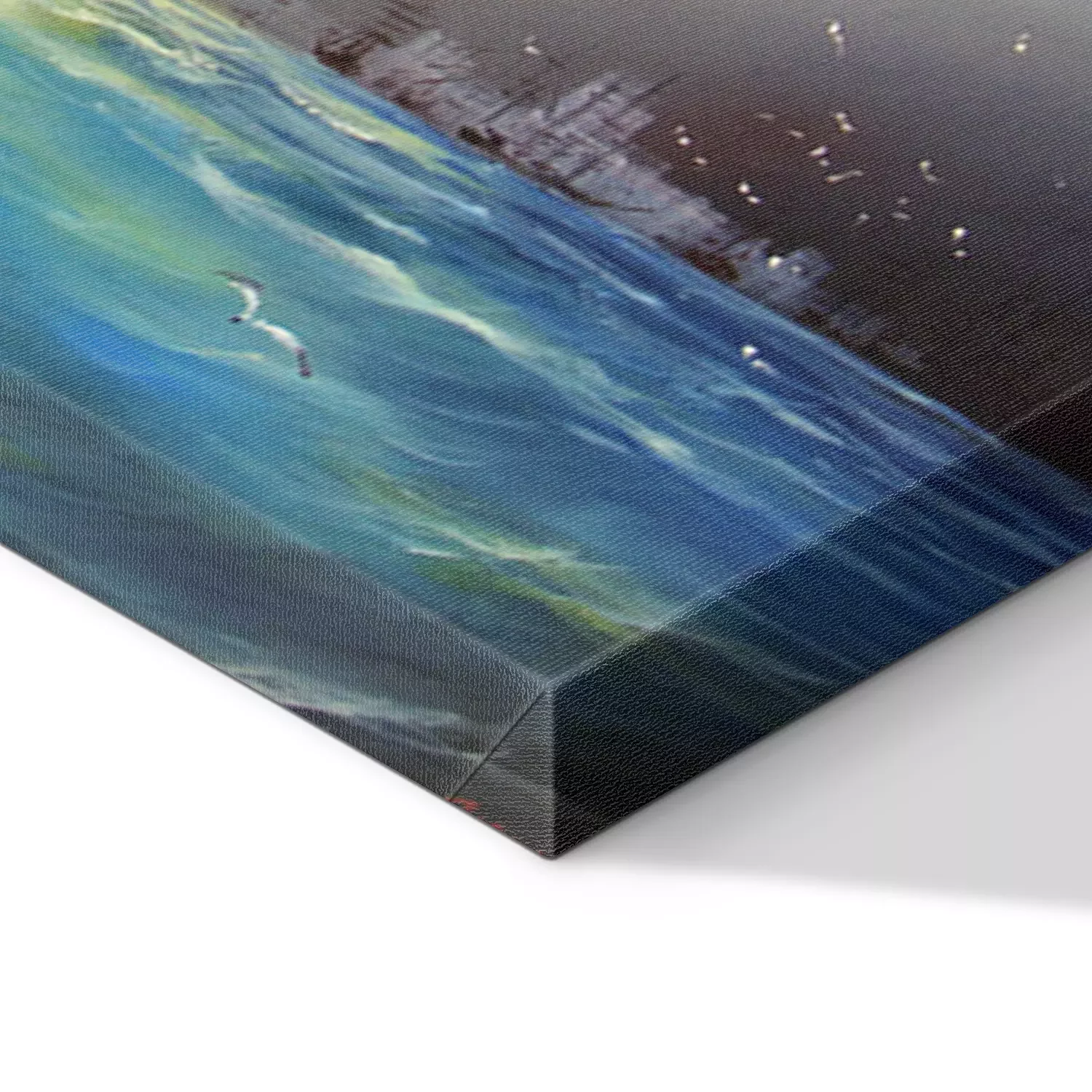 De print wordt aangebracht op hoogwaardig canvas dat op een schildersweefgetouw (spieraam) wordt gespannen. Omdat de print de zijranden bedekt, hoeft het ontwerp niet met een extra kader te worden omlijst. Wij raden ook composities aan die uit meerdere foto's bestaan en zo een coherente compositie vormen.