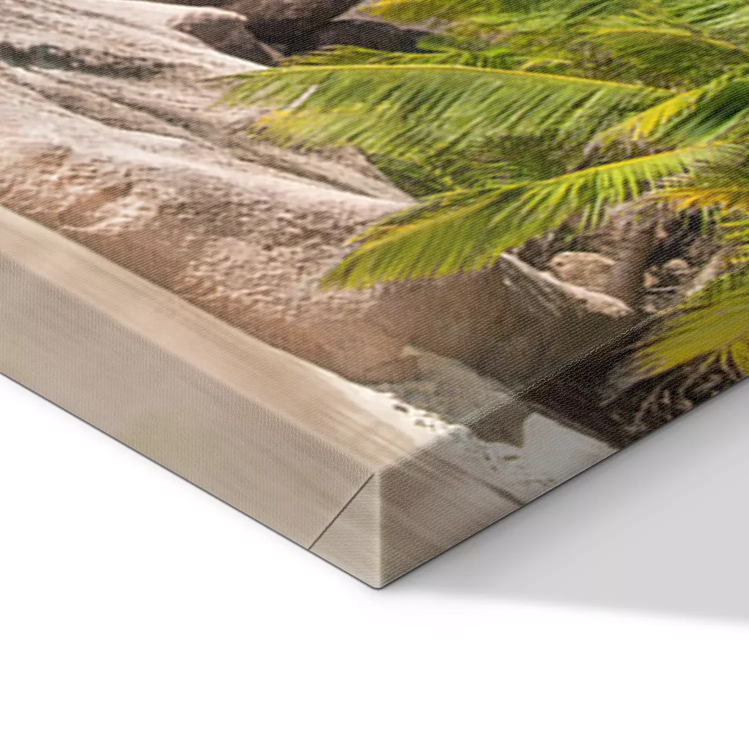 De print wordt aangebracht op hoogwaardig canvas dat op een schildersweefgetouw (spieraam) wordt gespannen. Omdat de print de zijranden bedekt, hoeft het ontwerp niet met een extra kader te worden omlijst. Wij raden ook composities aan die uit meerdere foto's bestaan en zo een coherente compositie vormen.