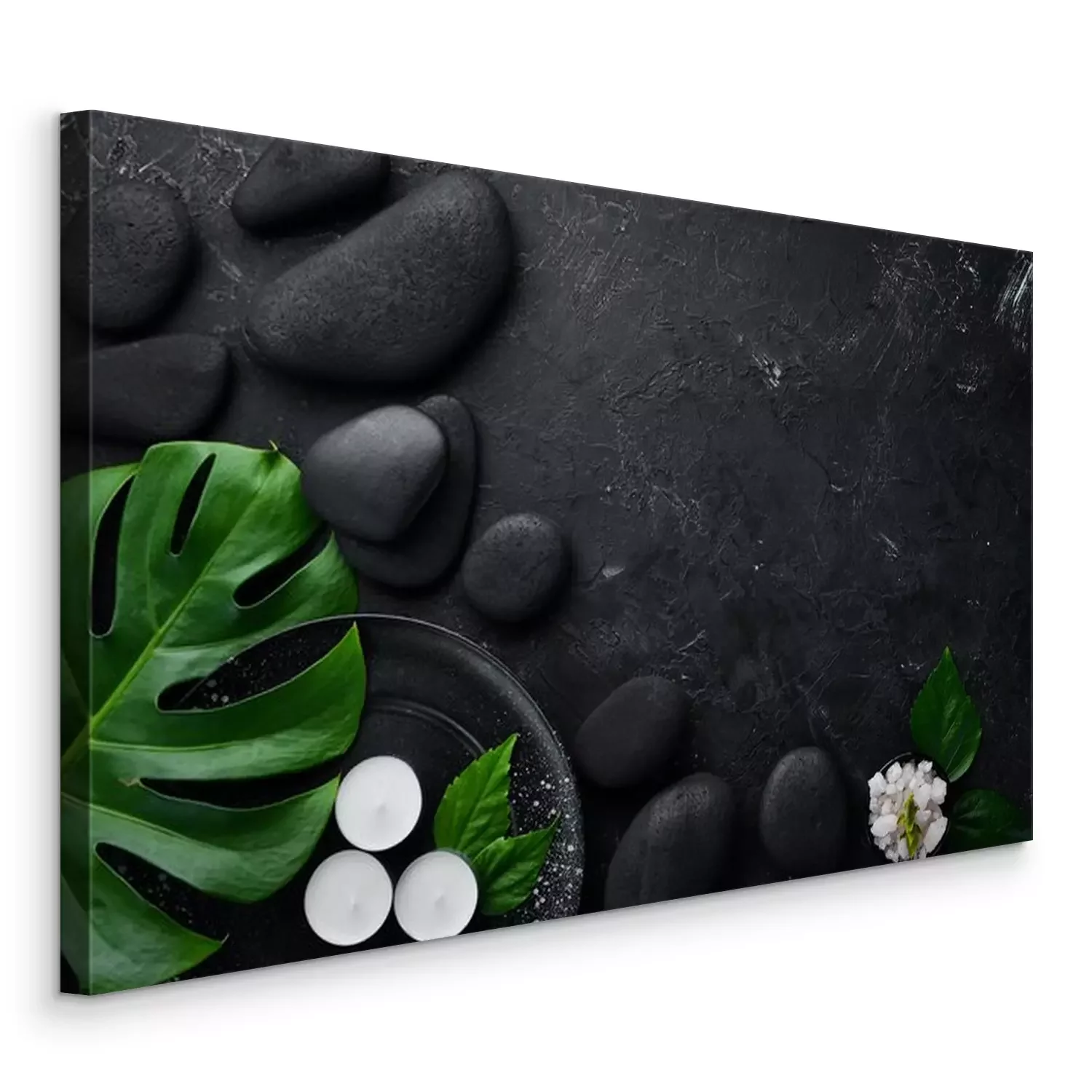 Canvas Zen stones and leaves with water drops. Spa background with spa accessories on a dark background. Top view. Free space for your text.