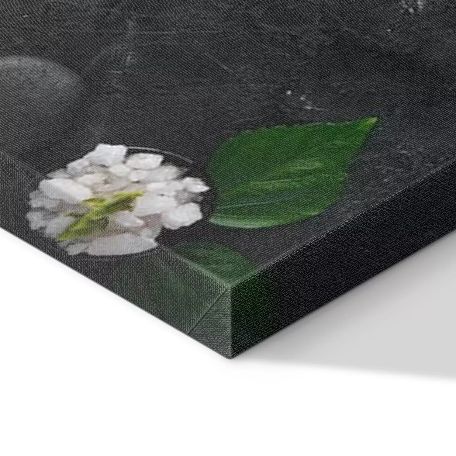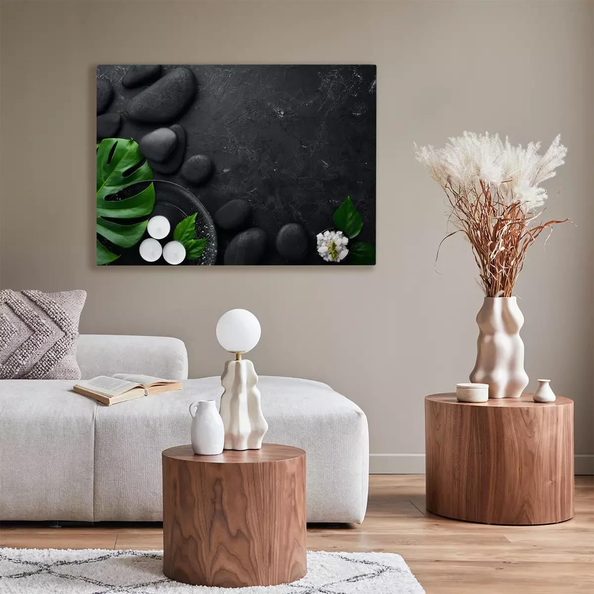 Canvas: Zen stones and leaves with water drops. Spa background with spa accessories on a dark background. Top view. Free space for your text.