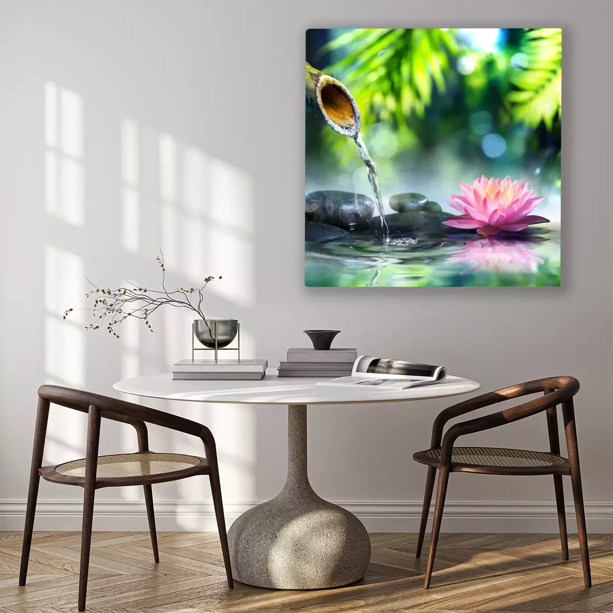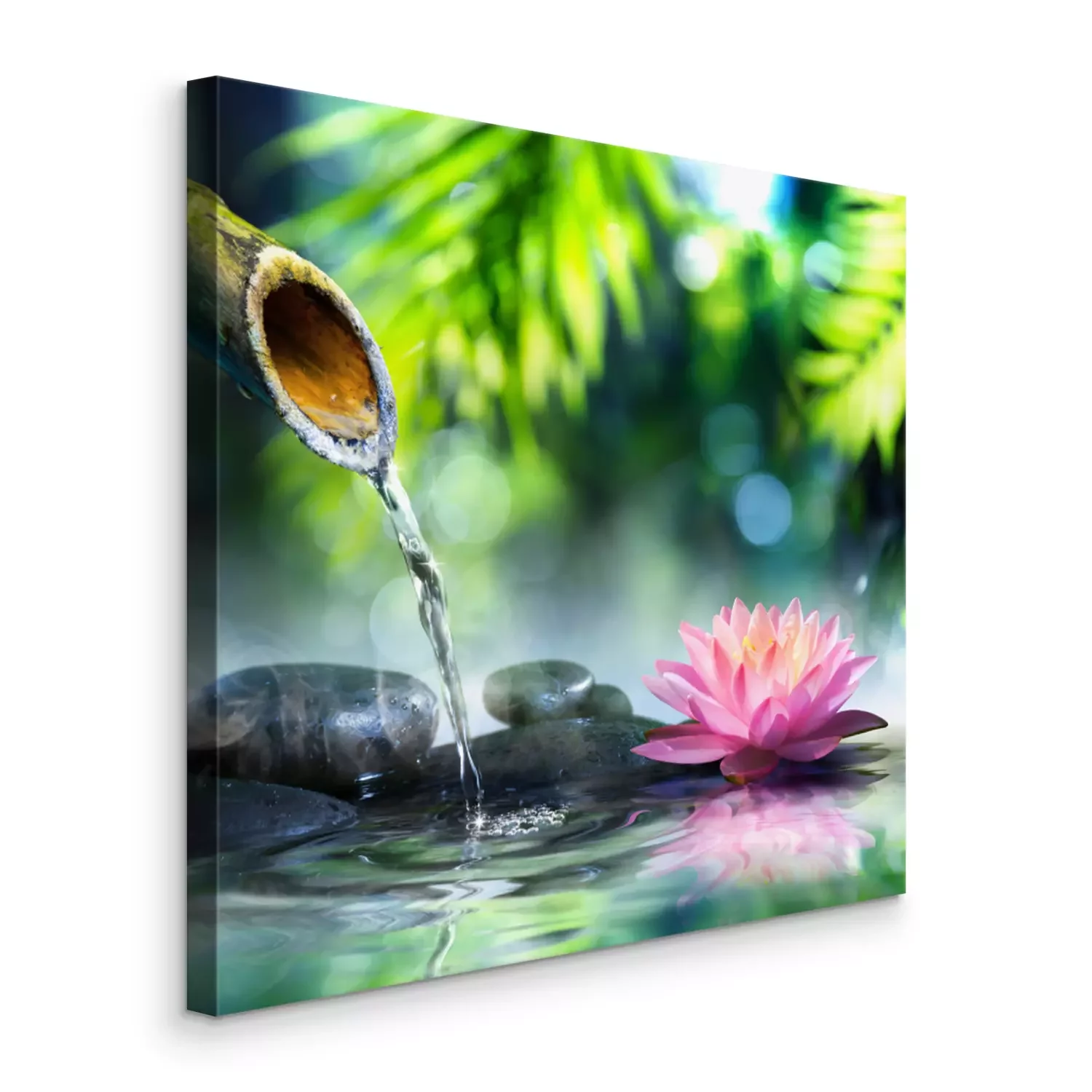Canvas zen tuin met zwarte stenen en roze waterlelie