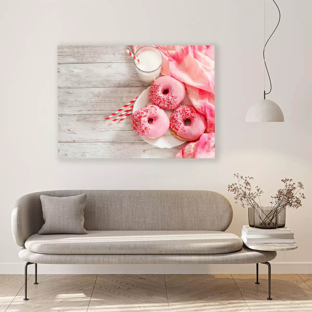 Canvas: zoete donuts met aardbeien en kersen roze suikerglazuur en melk op een houten achtergrond