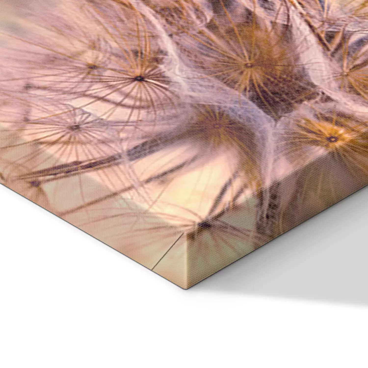 De print wordt aangebracht op hoogwaardig canvas dat op een schildersweefgetouw (spieraam) wordt gespannen. Omdat de print de zijranden bedekt, hoeft het ontwerp niet met een extra kader te worden omlijst. Wij raden ook composities aan die uit meerdere foto's bestaan en zo een coherente compositie vormen.