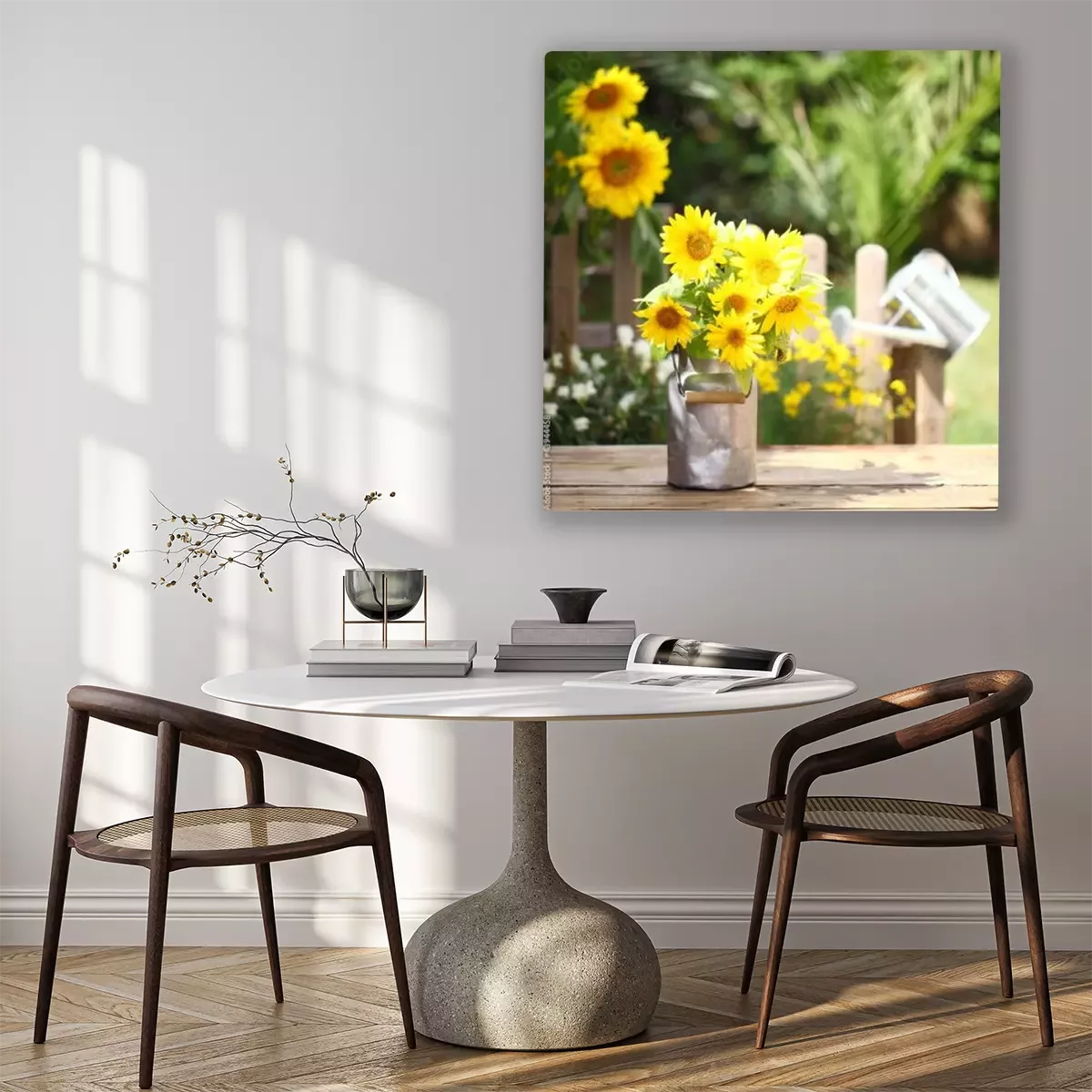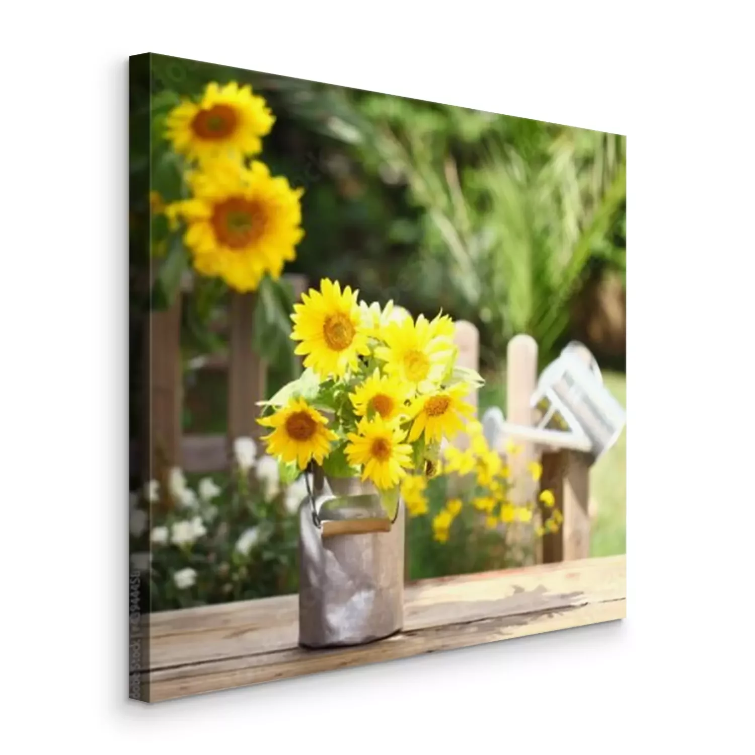 Canvas Zonnebloemen in een metalen vaas