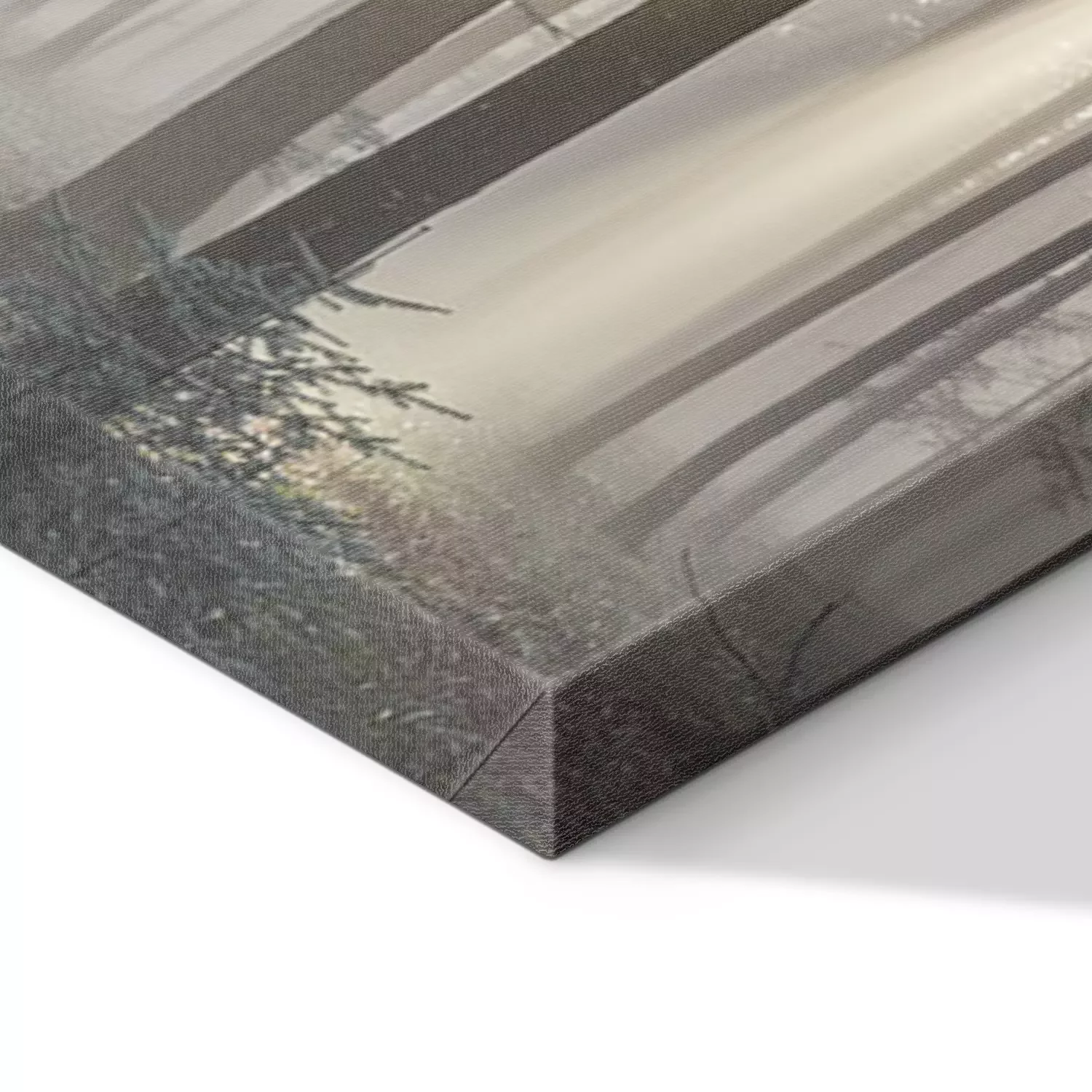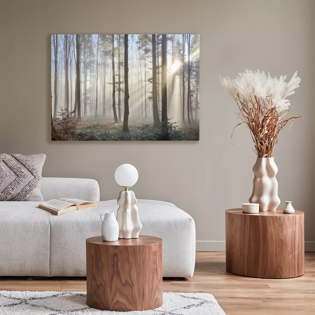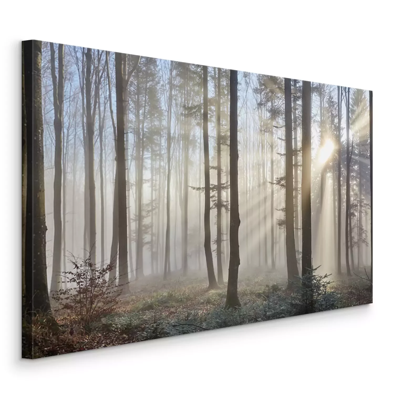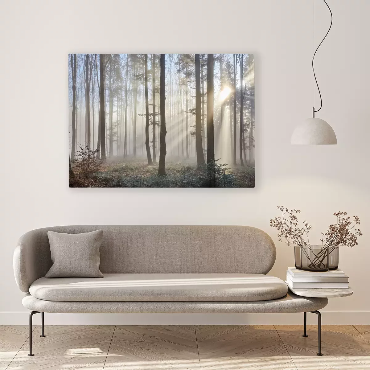 Canvas: Zonnestralen die het mistige bos binnendringen