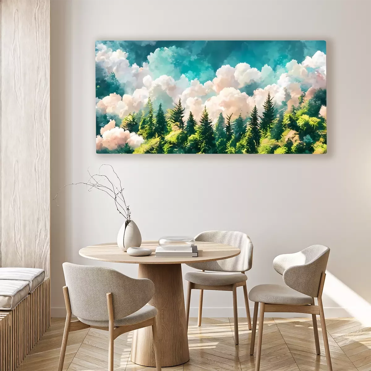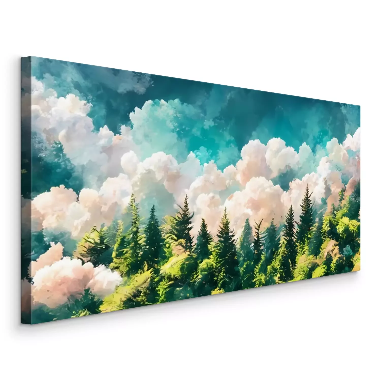 Canvas: Zonnig dicht bos gehuld in mist