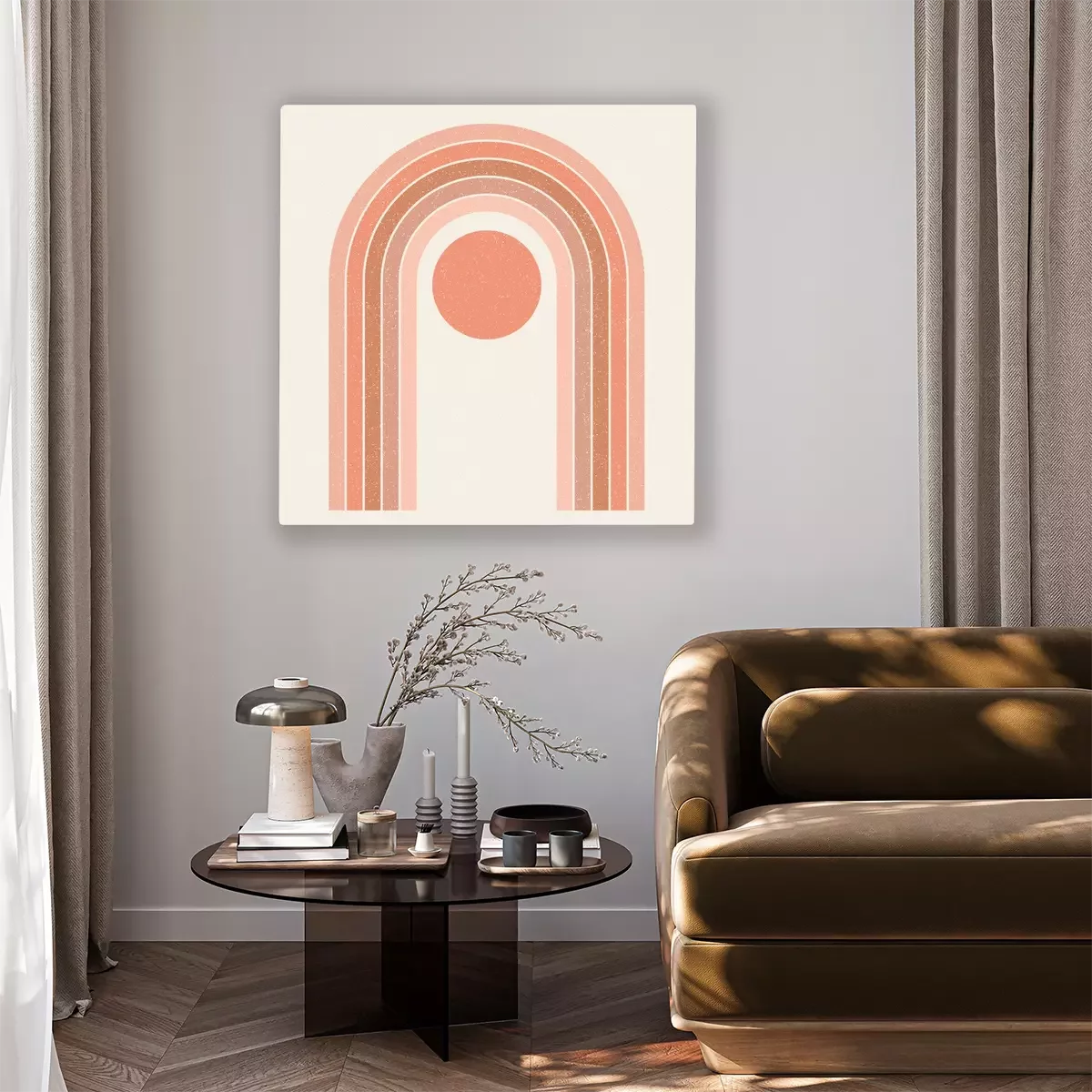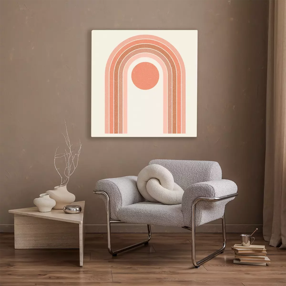 Abstract contemporary aesthetic background with geometric balance shapes, rainbow gates. Boho wall decor. Mid century modern minimalist neutral art print. Organic shape. Terracotta color, earth tone.