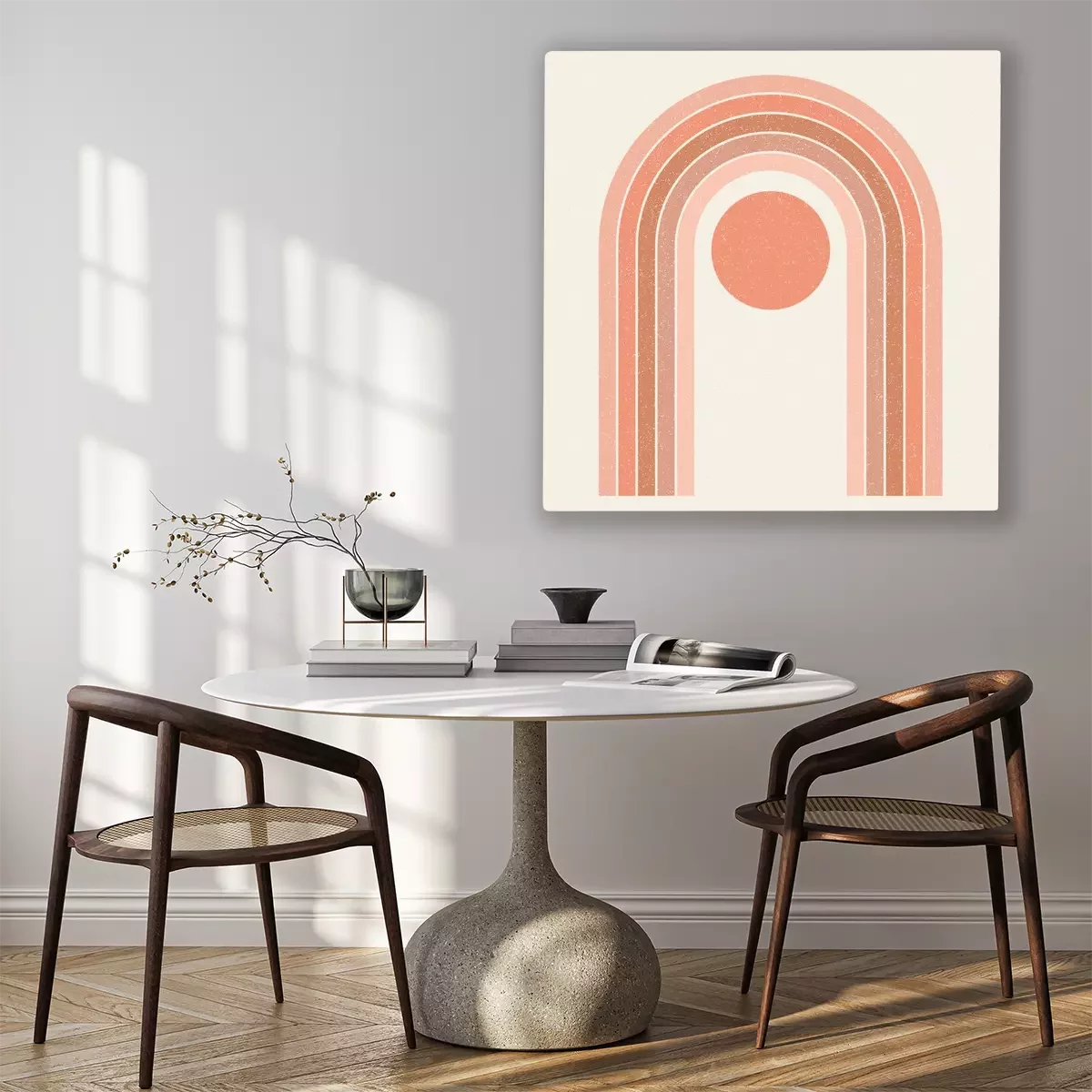 Abstract contemporary aesthetic background with geometric balance shapes, rainbow gates. Boho wall decor. Mid century modern minimalist print. Neutral Geometric art. Organic shape.