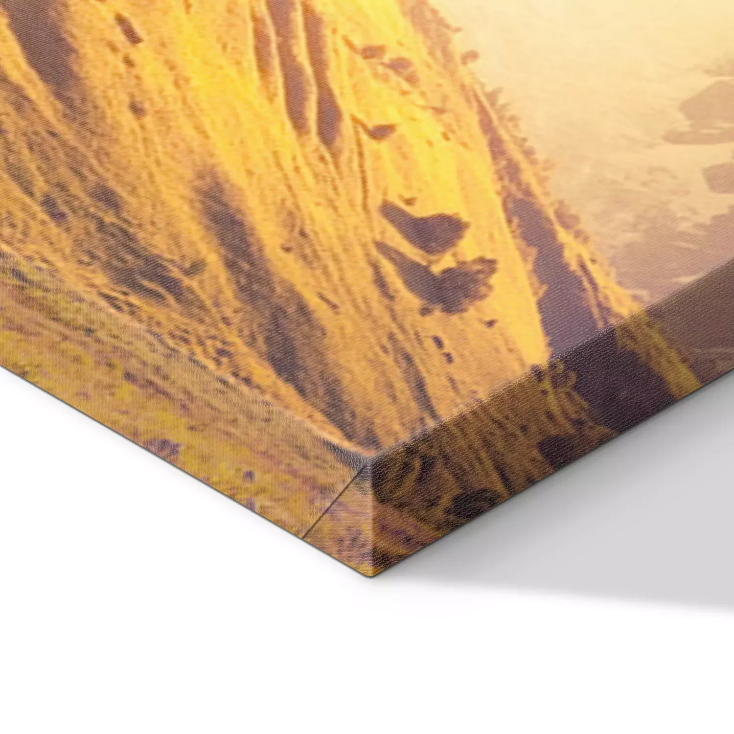 De print wordt aangebracht op hoogwaardig canvas dat op een schildersweefgetouw (spieraam) wordt gespannen. Omdat de print de zijranden bedekt, hoeft het ontwerp niet met een extra kader te worden omlijst. Wij raden ook composities aan die uit meerdere foto's bestaan en zo een coherente compositie vormen.