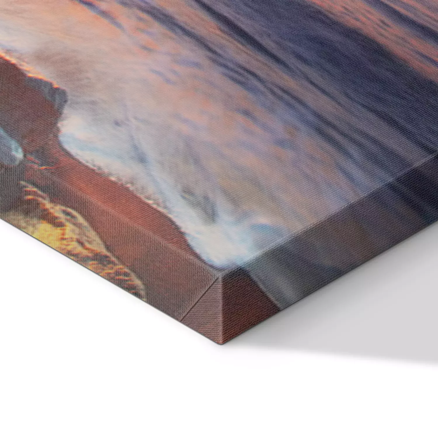 De print wordt aangebracht op hoogwaardig canvas dat op een schildersweefgetouw (spieraam) wordt gespannen. Omdat de print de zijranden bedekt, hoeft het ontwerp niet met een extra kader te worden omlijst. Wij raden ook composities aan die uit meerdere foto's bestaan en zo een coherente compositie vormen.