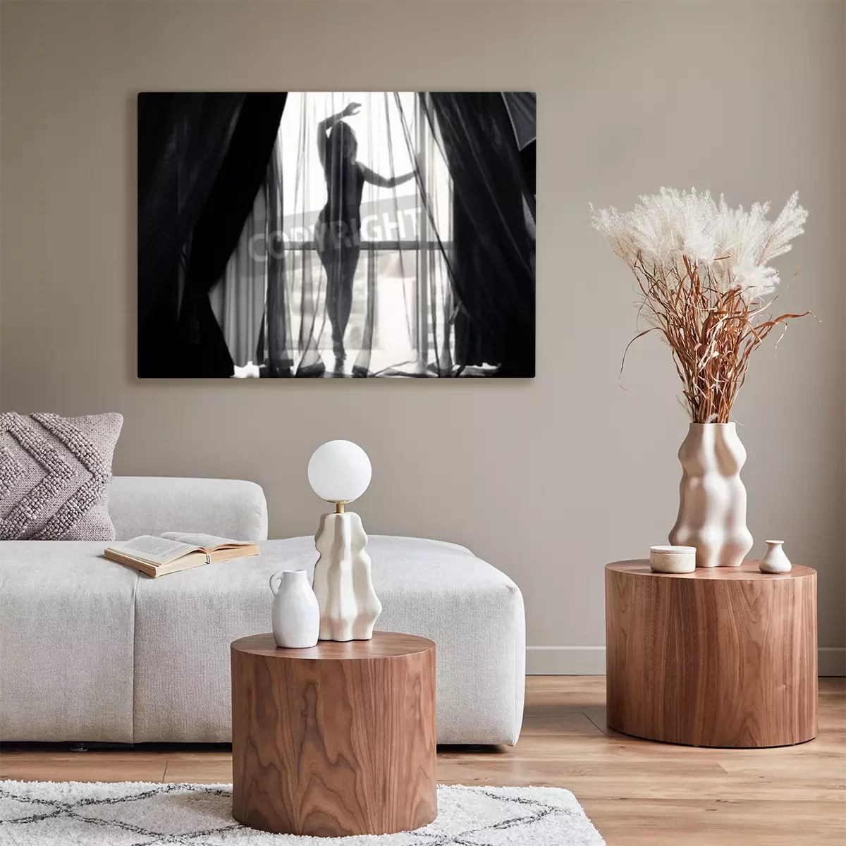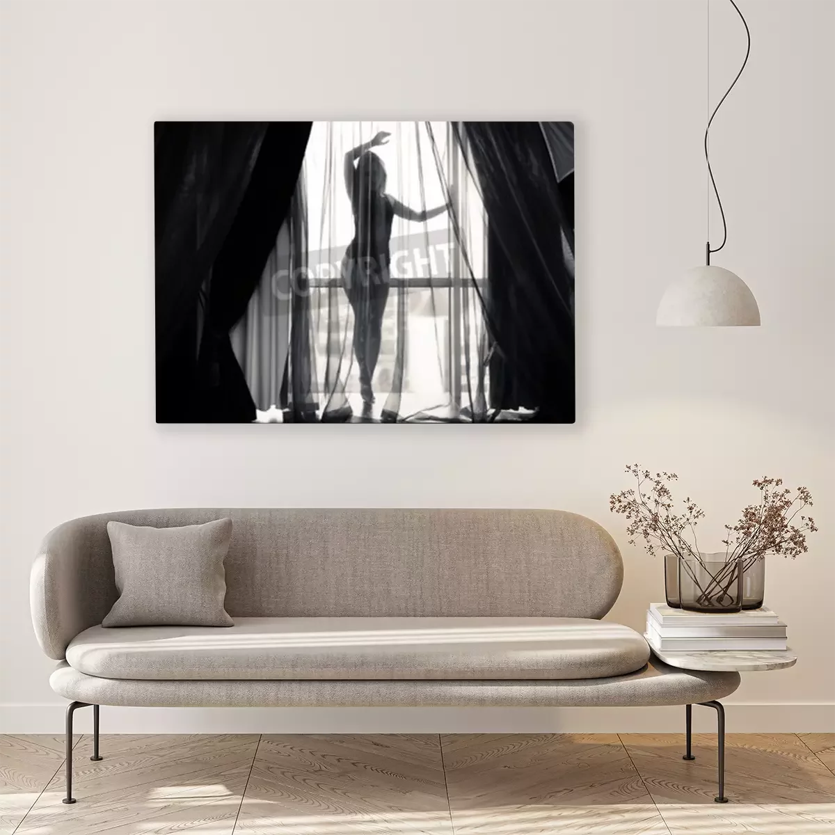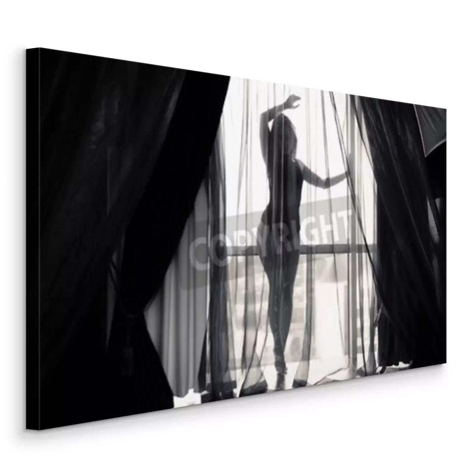 Canvas: Zwart en wit portret van sexy mooie jonge dame ontspannen op lichte achtergrond venster