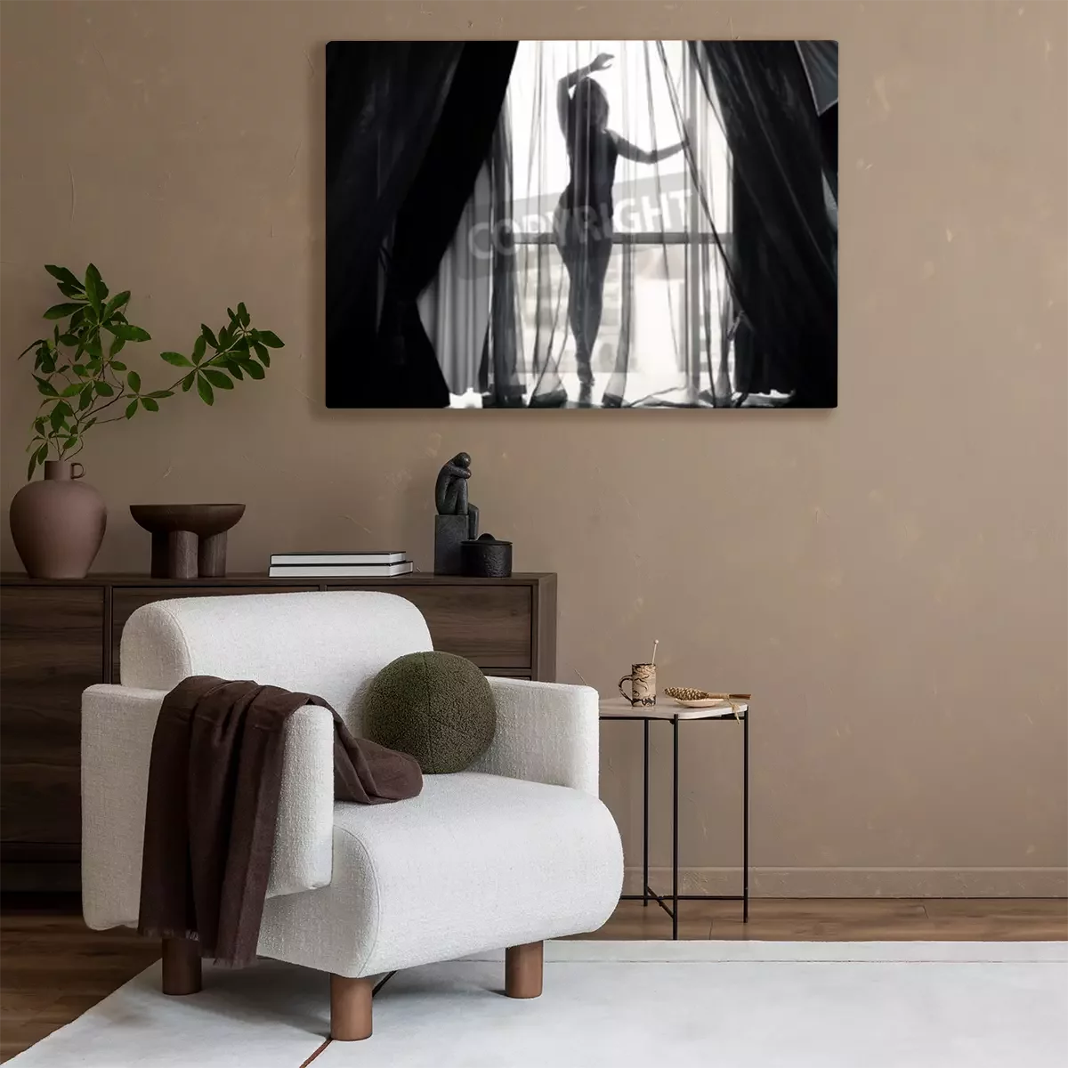 Canvas Zwart en wit portret van sexy mooie jonge dame ontspannen op lichte achtergrond venster
