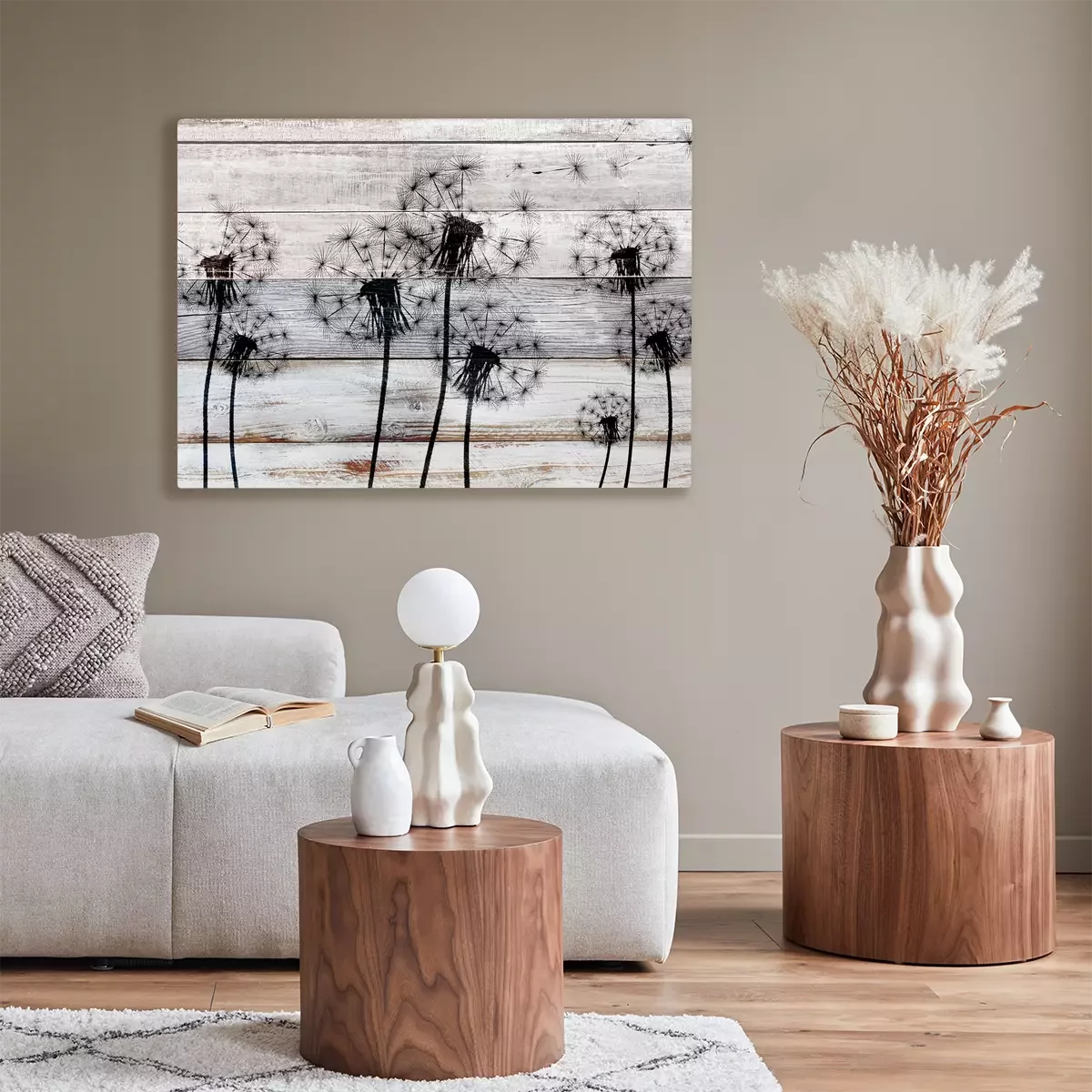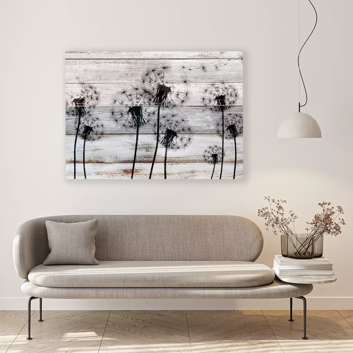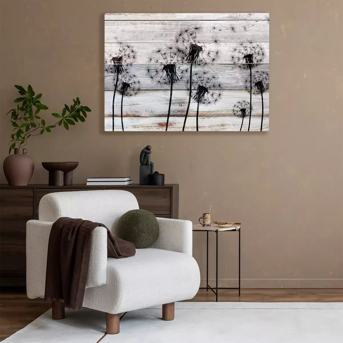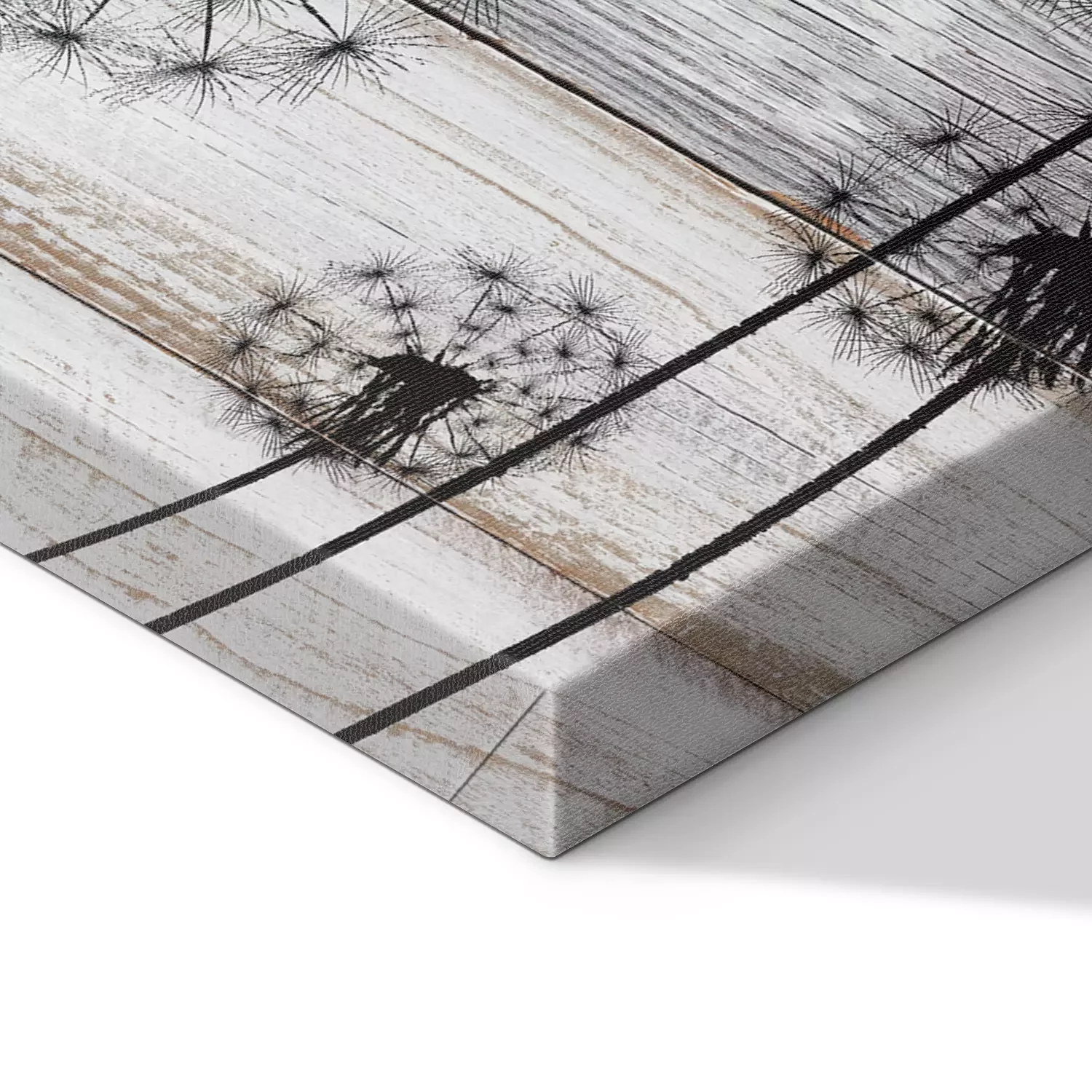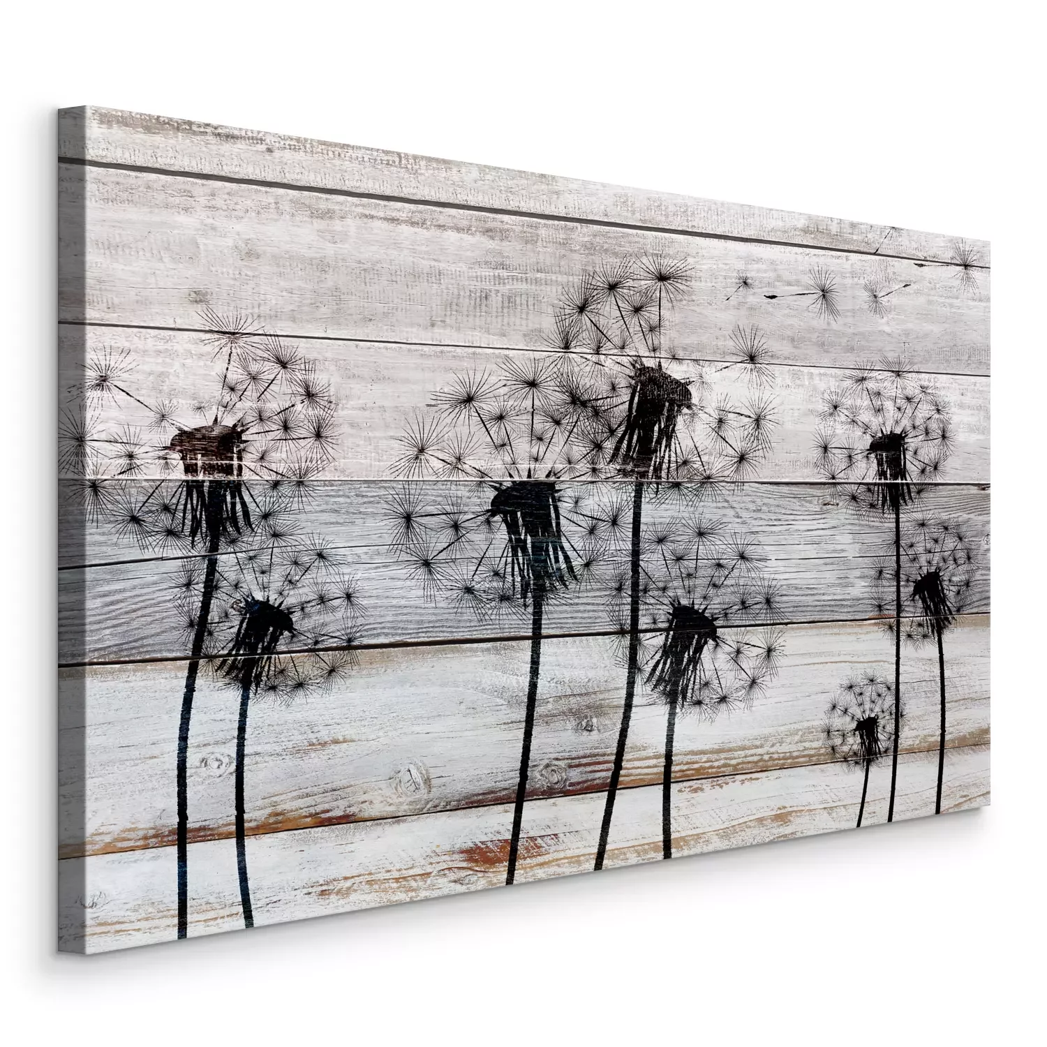 Zwart paardenbloemmotief op hout