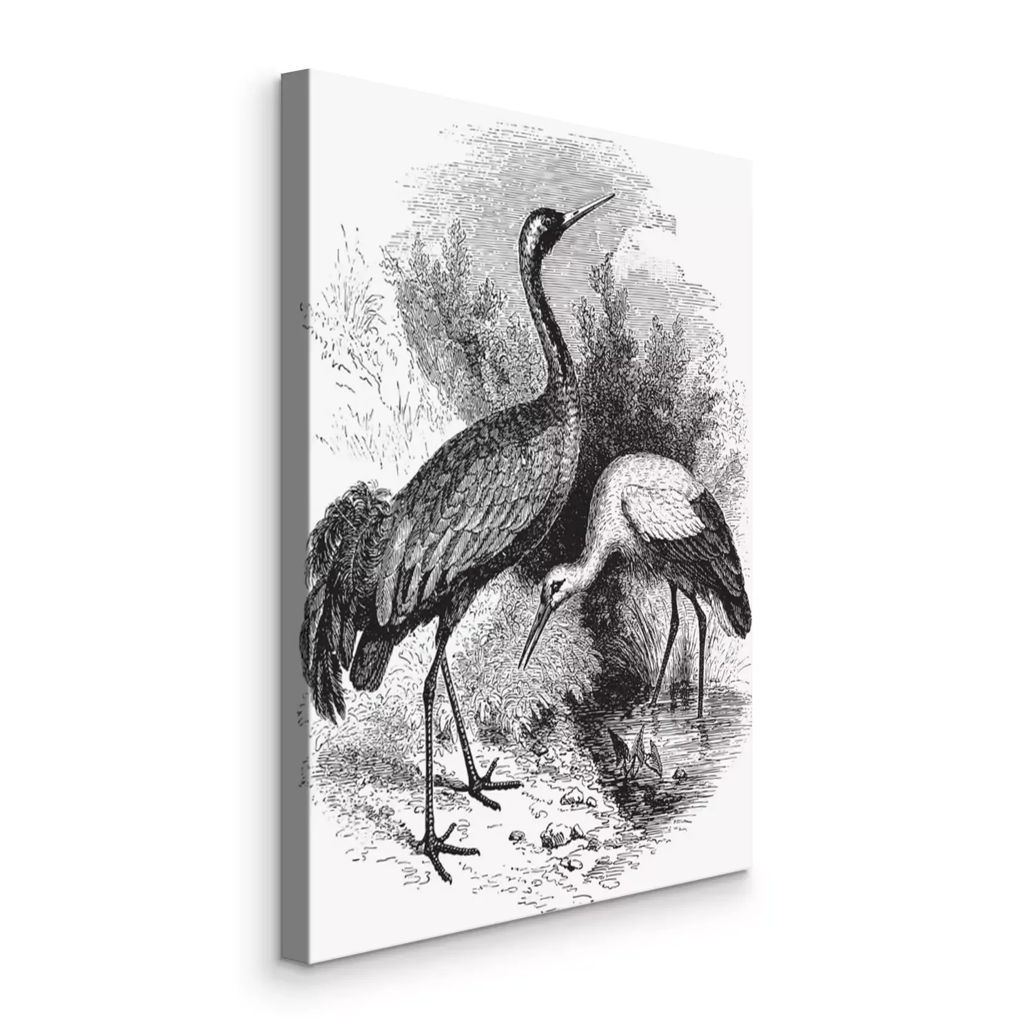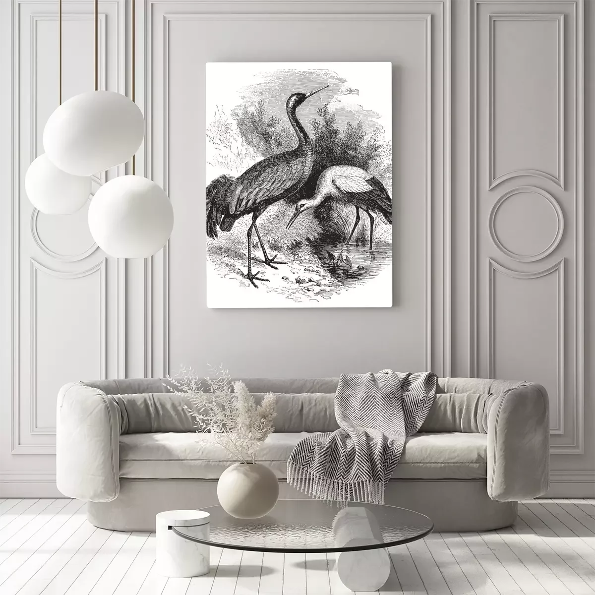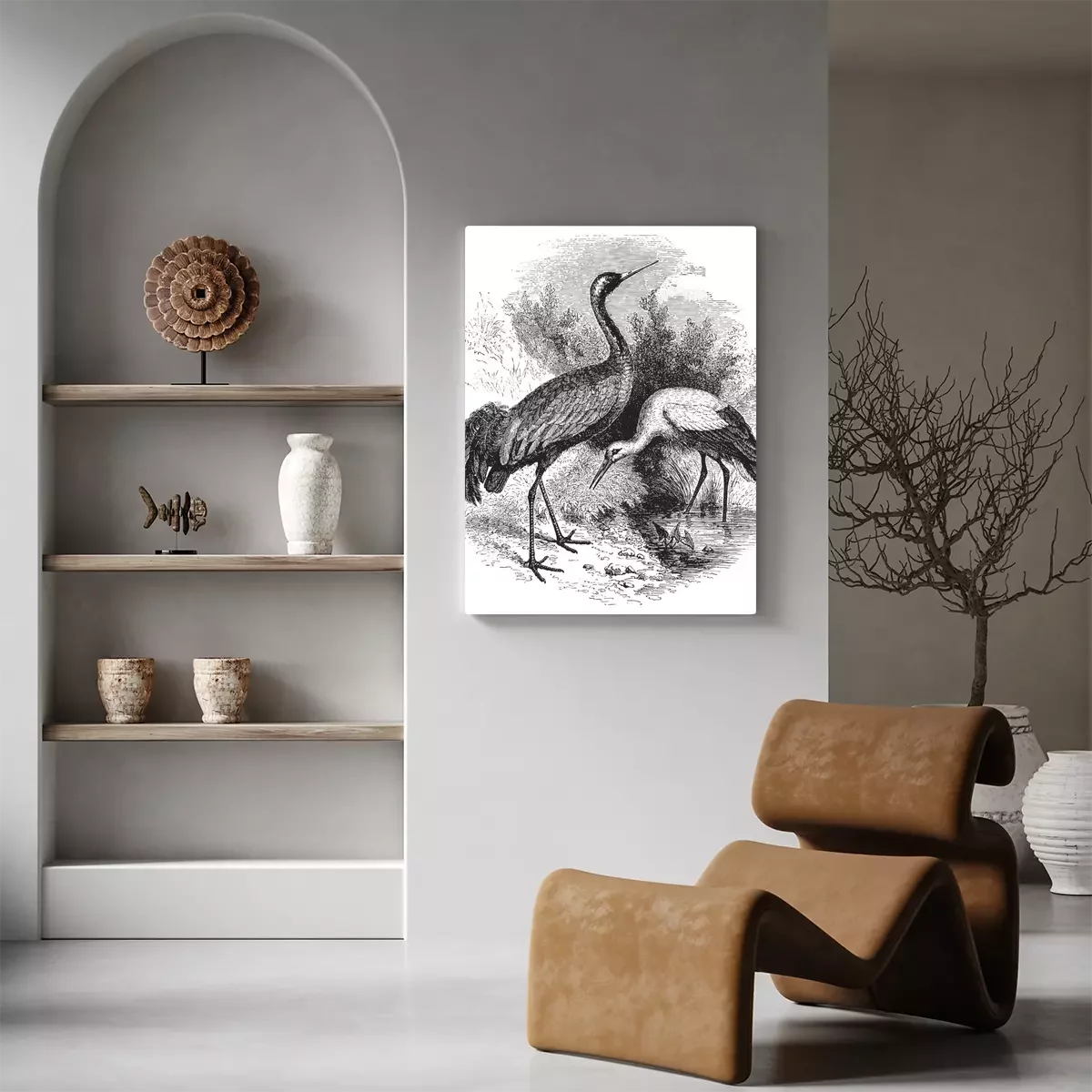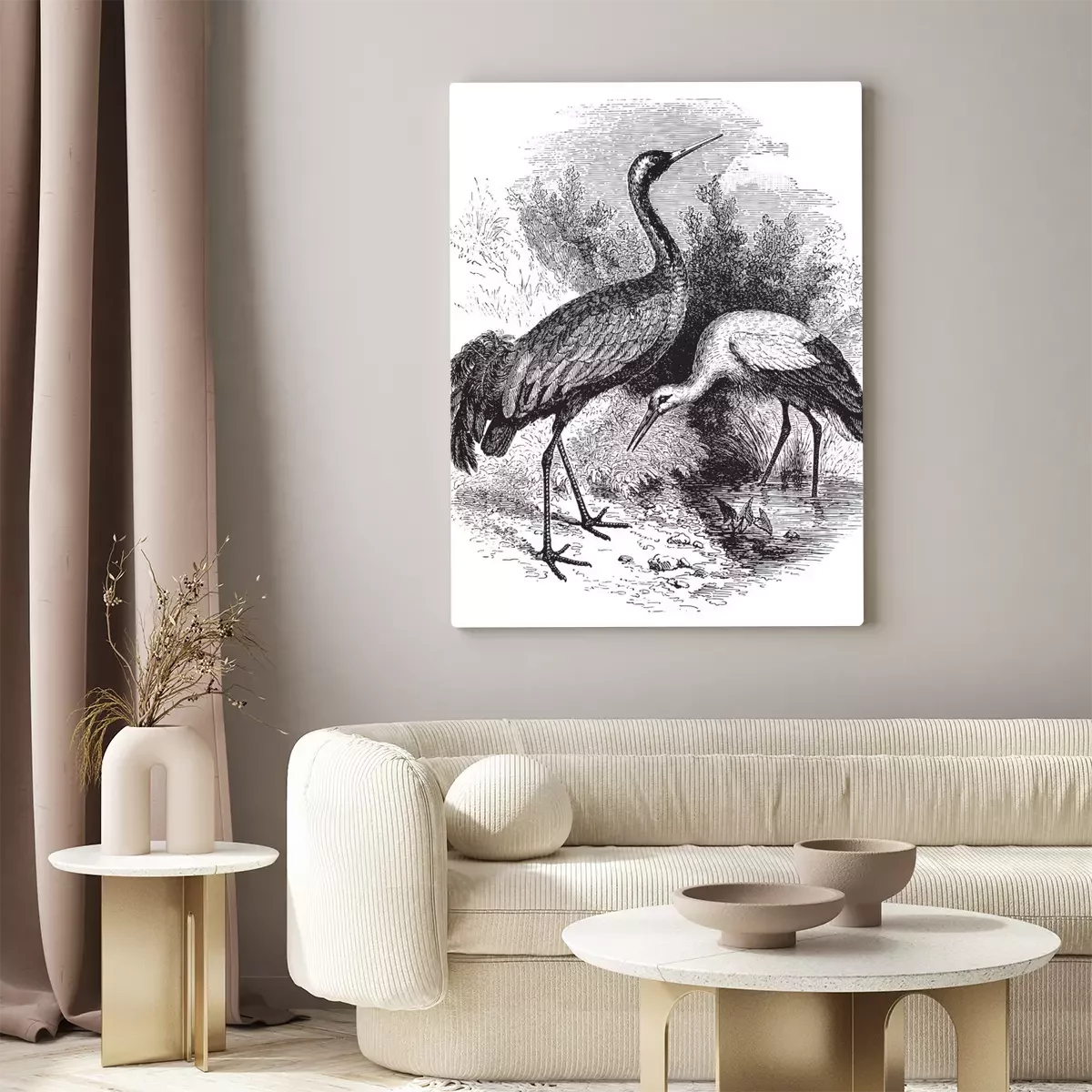 Canvas: Zwart-wit motief met een ooievaar en een kraanvogel