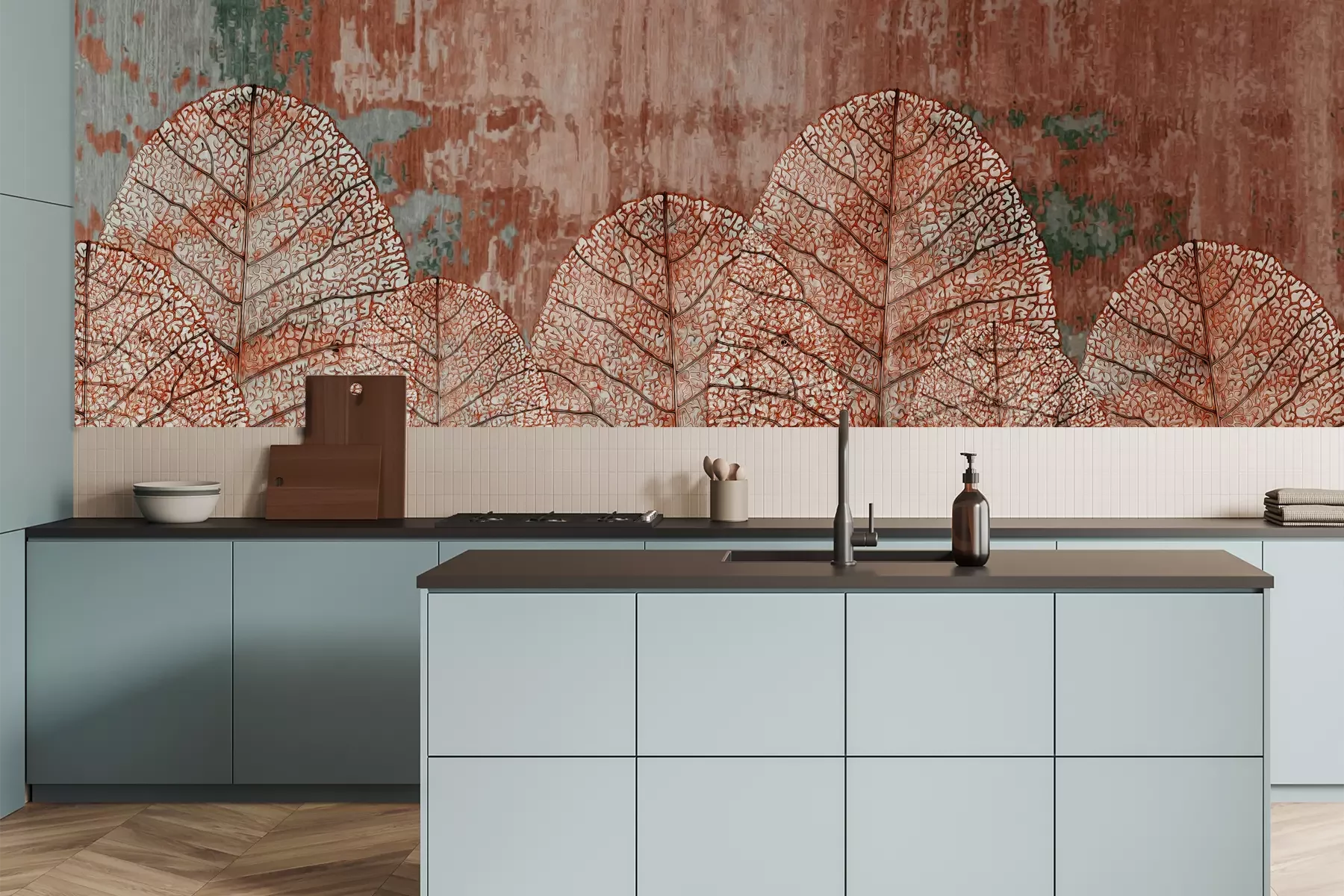 Het materiaal Premium is een glad vinyl op vlies, dat bestand is tegen uitrekken en vervorming. Het is dampdoorlatend – de muren kunnen vrij ademen – waardoor het geschikt is voor gebruik in de keuken en badkamer. Bij vervuiling kan het materiaal worden afgenomen met een vochtige doek. De maximale breedte van één baan bedraagt 95 of 105 cm, afhankelijk van de beschikbaarheid. Montage vindt plaats met de rand-aan-rand methode, wat een esthetisch resultaat zonder zichtbare naden oplevert. Omdat de lijm rechtstreeks op de muur wordt aangebracht, verloopt de installatie van het fotobehang snel en eenvoudig.