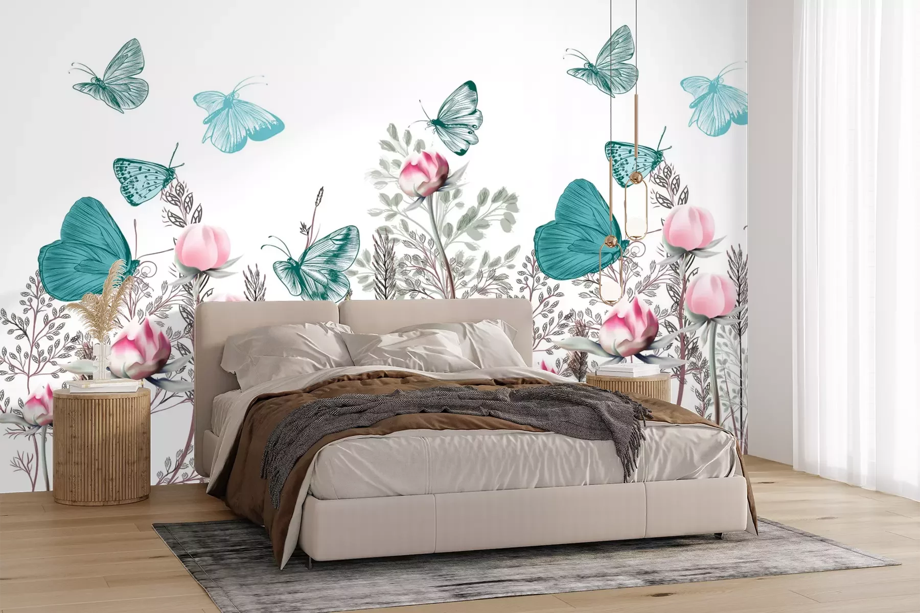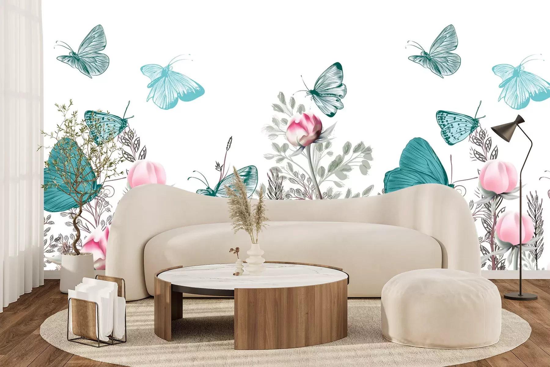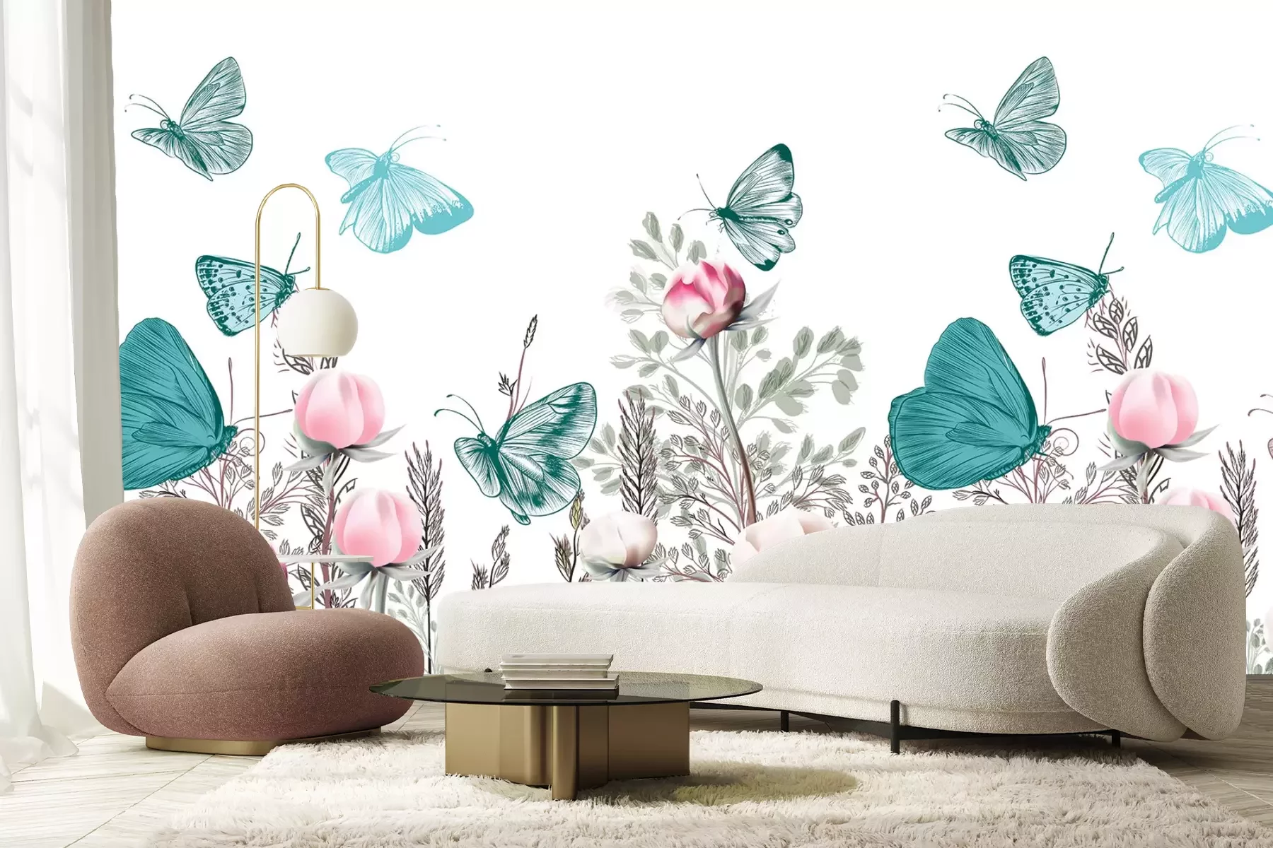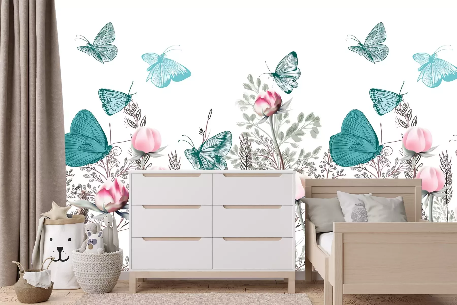 3d-bloemen met vlinders op een kleurrijk weidepatroon op een witte achtergrond