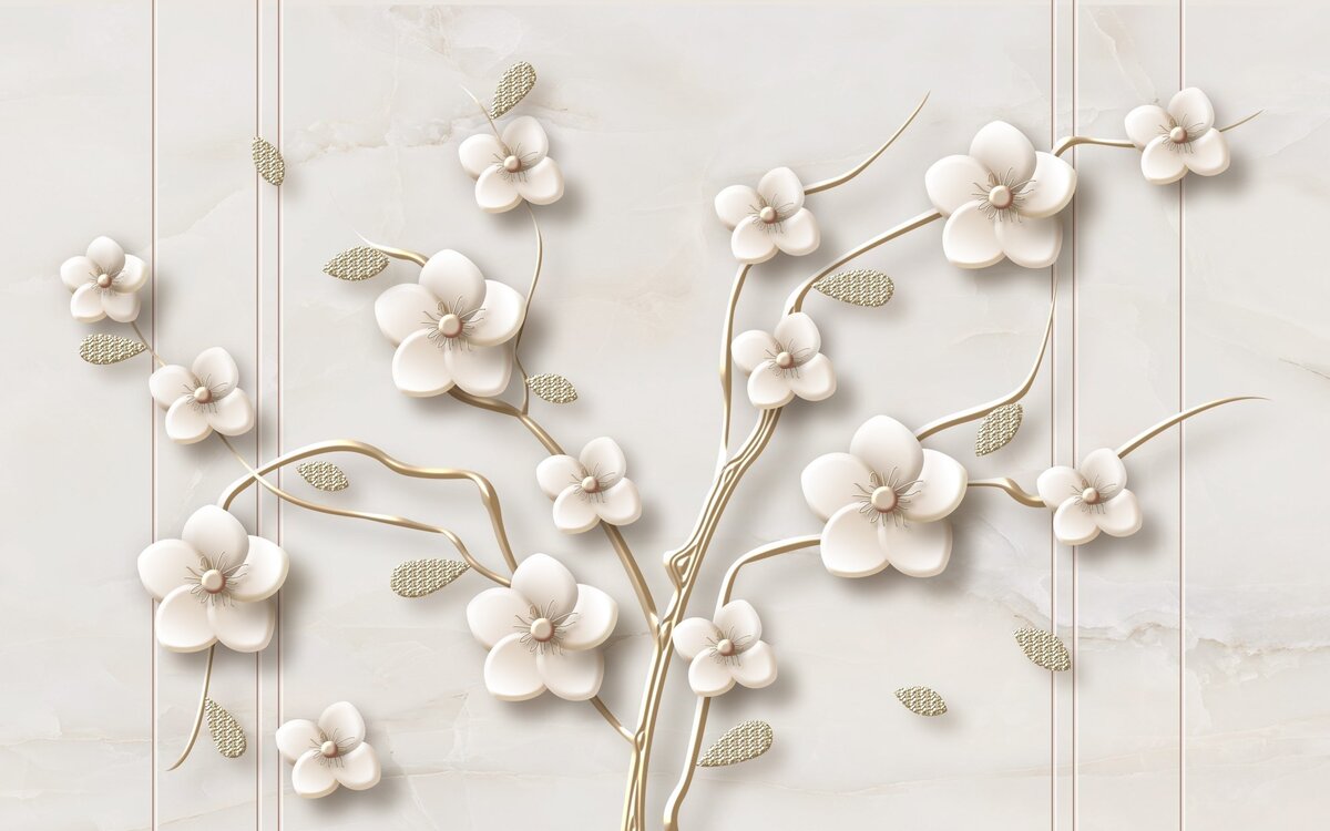 Fotobehang: 3D-boom met witte bloemen op een marmeren achtergrond