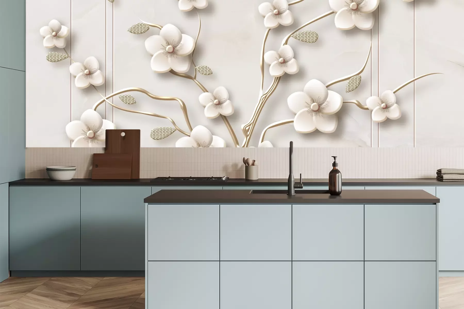 Het materiaal Premium is een glad vinyl op vlies, dat bestand is tegen uitrekken en vervorming. Het is dampdoorlatend – de muren kunnen vrij ademen – waardoor het geschikt is voor gebruik in de keuken en badkamer. Bij vervuiling kan het materiaal worden afgenomen met een vochtige doek. De maximale breedte van één baan bedraagt 95 of 105 cm, afhankelijk van de beschikbaarheid. Montage vindt plaats met de rand-aan-rand methode, wat een esthetisch resultaat zonder zichtbare naden oplevert. Omdat de lijm rechtstreeks op de muur wordt aangebracht, verloopt de installatie van het fotobehang snel en eenvoudig.