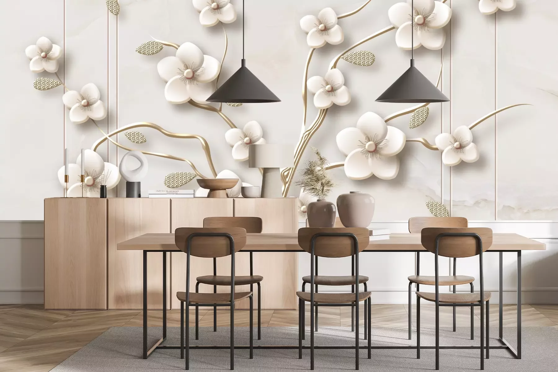 Het materiaal Premium+ is een gestructureerd vinyl op vlies met een gewicht van 255 g/m², dat kleine oneffenheden in de muur effectief camoufleert. De subtiele structuur van fijn zand geeft het oppervlak een exclusieve uitstraling, terwijl de halfmatte afwerking de diepte van de kleuren benadrukt. Het materiaal is dampdoorlatend, waardoor het ook in de keuken en badkamer kan worden gebruikt. De maximale breedte van één baan bedraagt 100 cm – bij grotere afmetingen wordt het fotobehang in meerdere gelijke banen verdeeld. De lijm wordt direct op de muur aangebracht en het behang wordt rand-aan-rand geplakt, wat zorgt voor een esthetisch resultaat zonder zichtbare naden. Het oppervlak kan gemakkelijk worden schoongemaakt door het voorzichtig af te nemen met een vochtige doek.